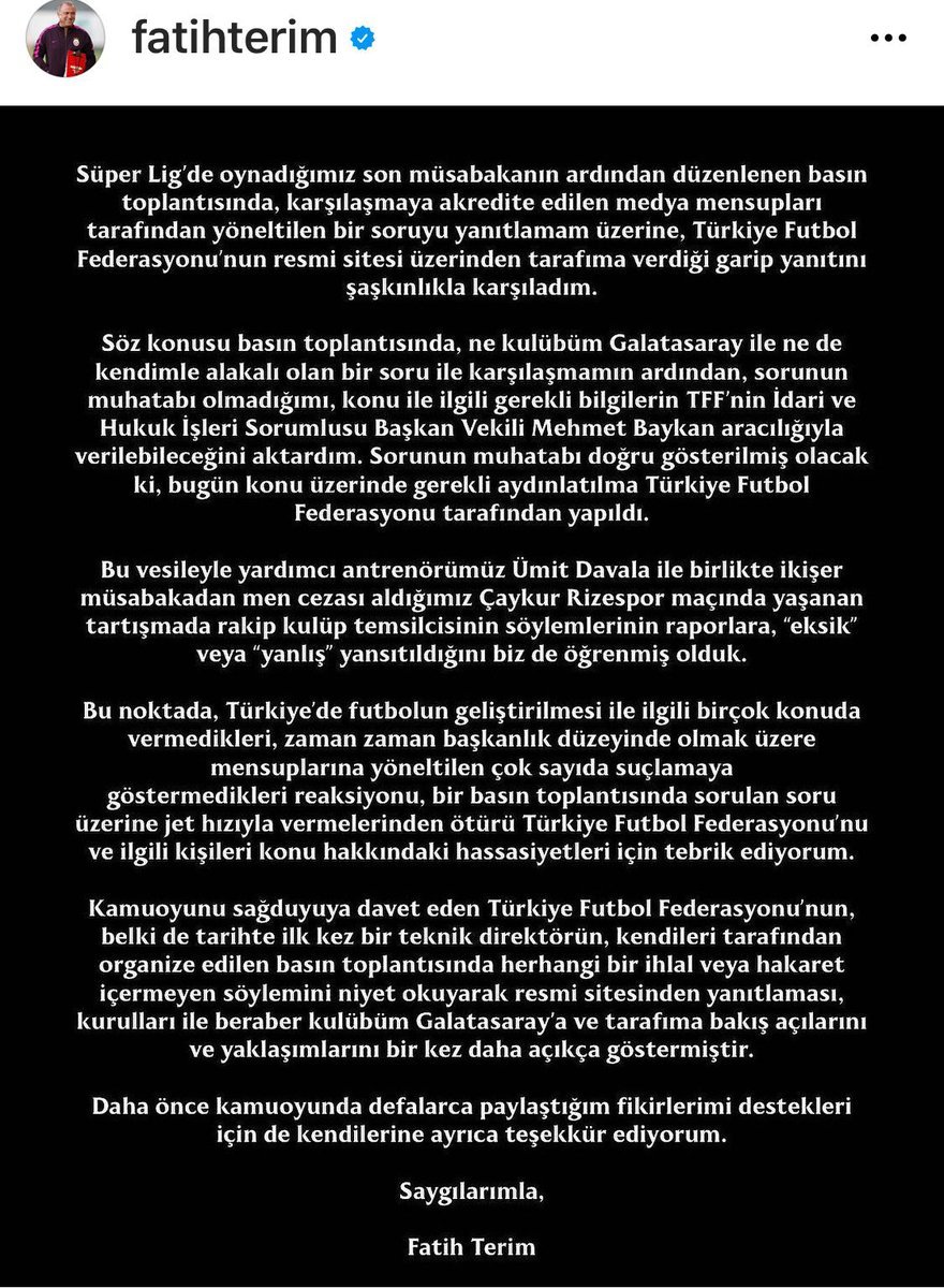 Galatasaray Teknik Direktörü Fatih Terim, Türkiye Futbol Federasyonu'nun (TFF) kendisi hakkında yaptığı açıklamaya cevap erdi. Galatasaray Teknik Direktörü Fatih Terim, Türkiye Futbol Federasyonu’nun kendisi hakkında bugün yaptığı açıklamaya cevap vererek, “TFF’nin yanıtını şaşkınlıkla karşıladım” dedi. TFF, Terim’in Galatasaray – Konyaspor maçı sonrası Fenerbahçe İdari Direktörü Emre Belözoğlu’nun PFDK’ya sevk edilmemesi ile ilgili olarak ‘Mehmet Baykan’a sorun’ şeklindeki sözleri sonrasında bir açıklama yapmıştı.Sarı-kırmızılı kulübün teknik Direktörü Fatih Terim, TFF’nin bugün yaptığı açıklamaya tepki gösterdi. Terim, sosyal medya hesabından konuyla ilgili yaptığı açıklamada şu ifadelere yer verdi:“Süper Lig’de oynadığımız son müsabakanın ardından düzenlenen basın toplantısında, karşılaşmaya akredite edilen medya mensuplarını tarafından yöneltilen bir soruyu yanıtlamam üzerine, Türkiye Futbol Federasyonu’nun resmi internet sitesi üzerinden tarafıma verdiği garip yanıtını şaşkınlıkla karşıladım.İlginizi Çekebilir