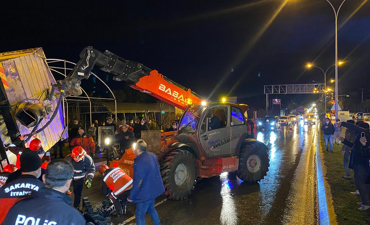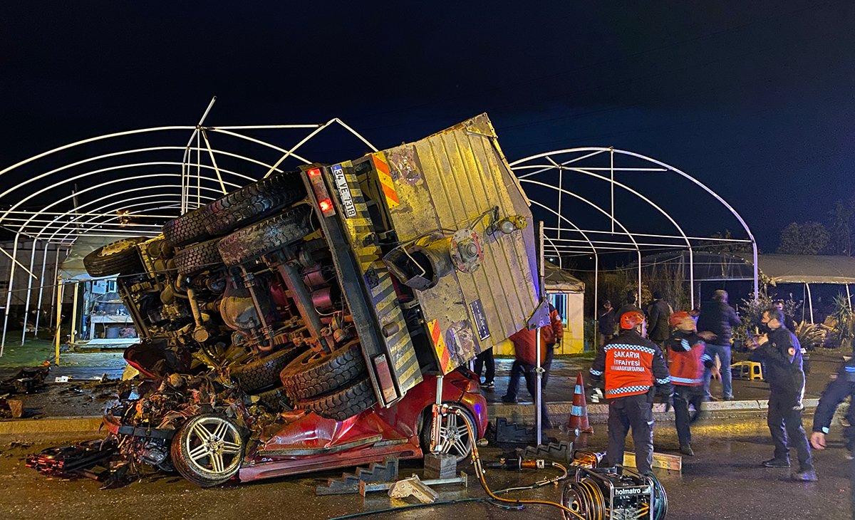 Sakarya'nın Serdivan ilçesinde kontrolden çıkan kamyon, 2 aracın üzerine devrildi. Kamyonun altında kalan 2 araç kullanılmaz hale geldi.