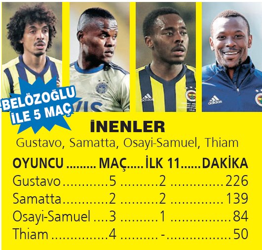 Fenerbahçe kadrosundaki dengeler değişti. Bulut’un vazgeçemediği isimler, Belözoğlu’nun gözünden düştü. Kanarya, Belözoğlu ile 5 maçta 4 galibiyet 1 beraberlik alırken takımın özellikle hücumdaki verimliliği bir hayli arttı. Fenerbahçe’de teknik sorumlu olduktan sonra 5 maçta 4 galibiyet ve 1 beraberlik alıp yenilgi yüzü görmeyen Emre Belözoğlu, geniş kadroyu verimli kullanmasıyla dikkat çekiyor.Genç hocanın, Erol Bulut'un vazgeçemediği isimlerin yerine kendi yıldızlarını ön plana çıkarması göze çarpıyor. Bulut'un, sakatlık ve cezaları olmadığı sürece sık şans verdiği isimlerden Gustavo, Samatta, Osayi-Samuel ve Thiam, Belözoğlu'nun gözünden düştü.