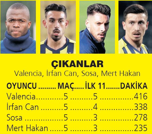 Luiz Gustavo, 5 maçın 2'sinde ilk 11'de şans buldu. Samatta, Osayi-Samuel ve Thiam da ‘yedek oyuncu' statüsüne düştü. Belözoğlu'nun 5 maçlık döneminde öne çıkan, Bulut'un çok tercih etmediği 4 isim var: Valencia, İrfan Can, Sosa ve Mert Hakan. Valencia'yı Bulut'un aksine santrfor olarak kullanan Belözoğlu, Sosa'yı ön liberoda, İrfan Can ve Mert Hakan'ı da ofansif orta sahada kullanıp takımın hücumdaki verimliliğini bir hayli artırdı.