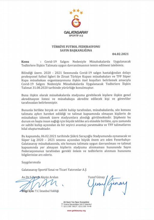 Galatasaray Kulübü, Fenerbahçe derbisinde tribüne corona tedbirlerini ihlal edecek taraftarların alınmaması konusunda TFF'ye başvuruda bulunduğu öğrenildi. Süper Lig’in 24. haftasında oynanan Galatasaray-Fenerbahçe derbisinde tribünde yer alan taraftarlar dikkat çekti. Galatasaray Kulübü’nün, Türkiye Futbol Federasyonu’na (TFF), 4 Şubat 2021 tarihinde corona virüsü tedbirlerinin ihlal edilmemesi konusunda başvuru yaptığı öğrenildi. Yapılan başvuruda, corona TFF tarafından alınan corona tedbirleri hatırlatılırken “Fenerbahçe-Galatasaray müsabakasında, söz konusu talimatlara uygun davranılması ve talimat kapsamında yer almayan kişilerin stadyuma alınmaması hususunda Sayın Federasyonunuz tarafından gerekli önlem ve tedbirlerin alınması hususunu arz ederiz” denildi.