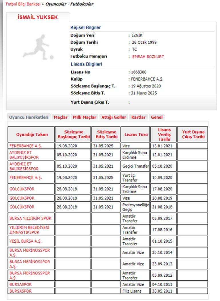 Fenerbahçe'de, TFF 1. Lig ekiplerinden Balıkesirspor'a kiralanan İsmail Yüksek geri çağrılarak lisansı tekrar çıkartıldı. Fenerbahçe’nin Gölcükspor’dan 65 bin Euro bonservis bedeliyle kadrosuna kattığı 21 yaşındaki İsmail Yüksek, kiralık olarak TFF 1. Lig ekiplerinden Balıkesirspor’da forma giyiyordu. Sarı-lacivertlilerde alınan kararlar genç oyuncu takıma geri çağrıldı. Son dakika gelişmesine göre Yüksek’in lisansı TFF’ye yapılan bildirimle tekrar çıkartıldı. İsmail Yüksek, Balıkesirspor’da 12 resmi maça çıkıp, 1 gol attı ve 1 asist yaptı.