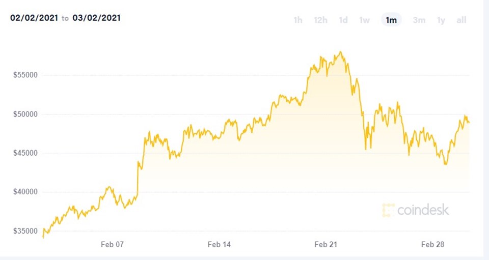 Şubat ayına 35 bin seviyelerinde başlayan Bitcoin, 21 Şubat’ta 58 bin seviyelerine yükselmiş, ayın geri kalanında da 48 ila 50 bin arasında işlem görmüştü.