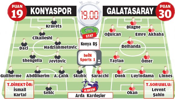 Galatasaray, bugün Konyaspor deplasmanına önemli isimlerden yoksun çıkacak. Arda, Feghouli, Falcao, Emre Kılınç, Marcao, Omar ve Etebo’suz Cimbom, 3 puan mücadelesi verecek. Fatih Terim’in cezası bu maçla bitecek. Süper Lig'in 17. haftası bugün start alıyor ve Galatasaray, Konyaspor deplasmanında sezonun en zorlu maçlarından birine çıkacak. Sarı- kırmızılılarda sakatlık ve cezalılardan dolayı bir hayli eksiğin bulunması karşılaşmanın zorluk derecesini bir kat daha artırmış durumda. Fatih Terim kulübede olmayacak ve cezası bu maçla sona erecek. Kaptan Arda Turan da kart cezası nedeniyle takımın liderliğini yapamayacak. Sakatlıkları süren Feghouli, Falcao ve Etebo ile havai fişek faciasıyla futbol hayatı tehlikeye giren Omar kadroda yok. Emre Kılınç ile Marcao da kart cezalısı. Antalya'ya karşı oynamayan Diagne, bu maçta Cimbom'un forveti olacak.
