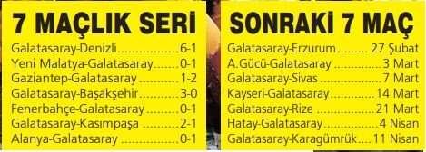1987-88 sezonunun sonu ve 1988-89 sezonunun başında 12 maçlık serisi olan G.Saray geçen sezon üst üste 8 kez kazanmıştı. Lig tarihinde bir sezonda üst üste en çok maç kazanma rekoru ise Beşiktaş'a ait. Siyah-beyazlılar, 1959-1960 sezonunda 10-22. haftalarda üst üste 13 maç kazandı. Bu rekoru kırmaya en yakın takım Galatasaray. Aslan, galibiyet serisini 14 maça çıkarabilirse Kara Kartal'ın 61 yıllık rekorunu nisan başında tarihe gömmüş olacak.