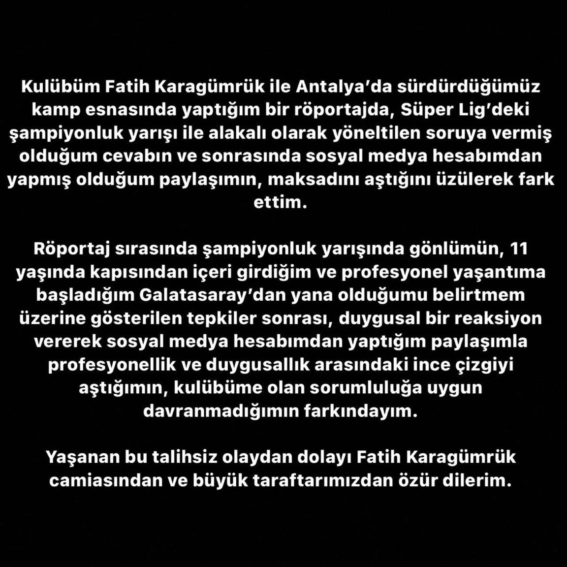 Eski takımı Galatasaray ile oynanacak maç öncesi sosyal medya hesabından yaptığı paylaşım nedeniyle tepki çeken Fatih Karagümrüklü milli futbolcu Emre Çolak ifadelerinin maksadını aştığını söyleyerek özür diledi. İstanbul ekibi 29 yaşındaki oyuncuyu kadro dışı bıraktı. Süper Lig ekiplerinden Fatih Karagümrük forması giyen Galatasaray’ın eski oyuncusu Emre Çolak, geçtiğimiz günlerde sosyal medya hesabından yaptığı gündem yaratan paylaşımı nedeniyle kadro dışı bırakıldı. Karagümrük Kulübü yaptığı resmi açıklamayla Emre Çolak’ın paylaşımının kulübün değerleri ve ilkeleri ile bağdaşmaması nedeniyle oyuncunun geçici olarak kadro dışı bırakıldığını duyurdu.