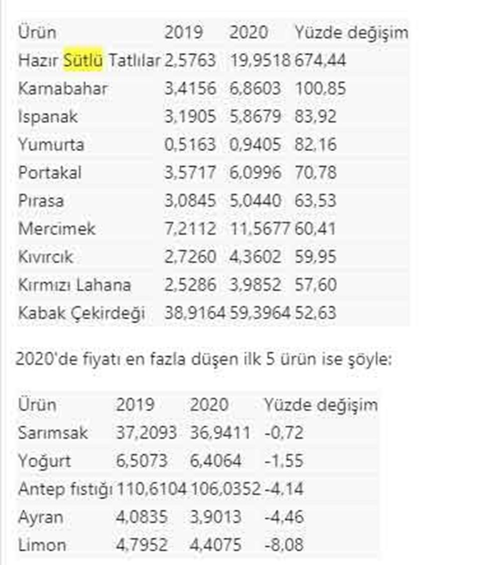 Söz konusu dönemde fiyatı en çok artan ürün yüzde 674,4 ile hazır sütlü tatlılar oldu. Bu ürünün kilogram fiyatı 20 liraya yaklaştı. Hazır sütlü tatlıları yaklaşık yüzde 100,9 ile karnabahar, yüzde 83,9 ile ıspanak, yüzde 82,2 ile yumurta, yüzde 70,8 ile portakal, yüzde 63,5 ile pırasa ve yüzde 60,4 ile mercimek izledi.
