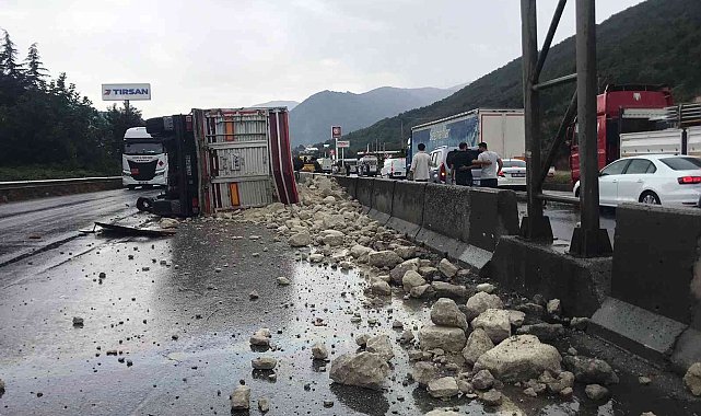 Sakarya'da D-650 Karayolu üzerinde kaygan zemin sebebiyle devrilen hafriyat kamyonundaki dolgu malzemeleri yola saçıldı.Kaza, D-650 Karayolu üzerinde Pamukova istikametinde meydana geldi. Edinilen bilgiye göre, sürücüsünün ismi öğrenilemeyen 39 FD 477 plakalı dolgu malzemesi yüklü hafriyat kamyonu, yağmur sonrası kayganlaşan zeminde sürücüsünün direksiyon hakimiyetini kaybetmesiyle birlikte refüje çarparak devrildi. Devrilen kamyonda yüklü olan malzemeler yola saçılırken, sürücü ise yaralandı. Kazayı gören vatandaşlar, kamyonun içinde sıkışan yaralı sürücüye yardıma koşarken durumu 112 Acil Çağrı Merkezi'ne bildirdi. İhbar üzerine adrese sağlık, itfaiye ve jandarma ekipleri sevk edildi. Kısa sürede adrese ulaşan sağlık ekipleri, yaralı sürücüye ilk müdahaleyi olay yerinde yaptı. Ardından ambulansa alınan sürücü, tedavi edilmek üzere hastaneye kaldırıldı. Yol üzerinde trafik yan yoldan kontrollü olarak sağlanırken, kazayla ilgili inceleme başlatıldı.