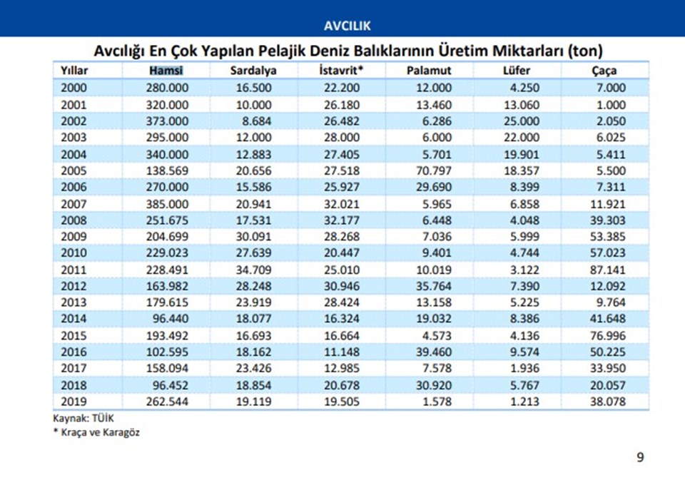 Türkiye'deki 10 yıllık hamsi üretim miktarının yer aldığı raporda, 2002 yılında 373 bin ton hamsinin olduğu, ancak bu sayının 2014 ve 2018 yılında 96 bin ton civarına gerilediği görülüyor.