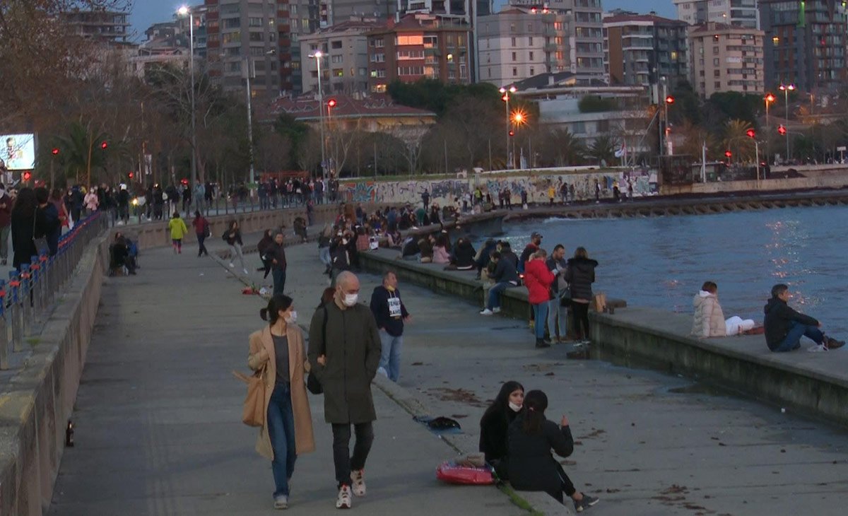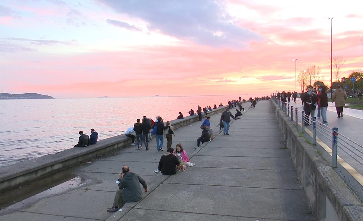 Corona tedbirleri kapsamında her gün uygulanan ve saat 21.00’de başlayan sokağa çıkma kısıtlamasına saatler kala vatandaşlar Caddebostan Sahili’ni doldurdu.