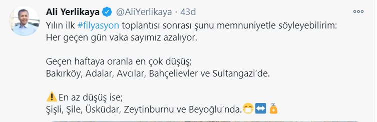 İstanbul Valisi Ali Yerlikaya, Twitter hesabından vaka sayılarındaki düşüşle ilgili bir açıklama yaptı.Yerlikaya, paylaşımında şu bilgilere yer verdi:* Yılın ilk filyasyon toplantısı sonrası şunu memnuniyetle söyleyebilirim. Her geçen gün vaka sayımız azalıyor. Geçen haftaya oranla en çok düşüş; Bakırköy, Adalar, Avcılar, Bahçelievler ve Sultangazi’de