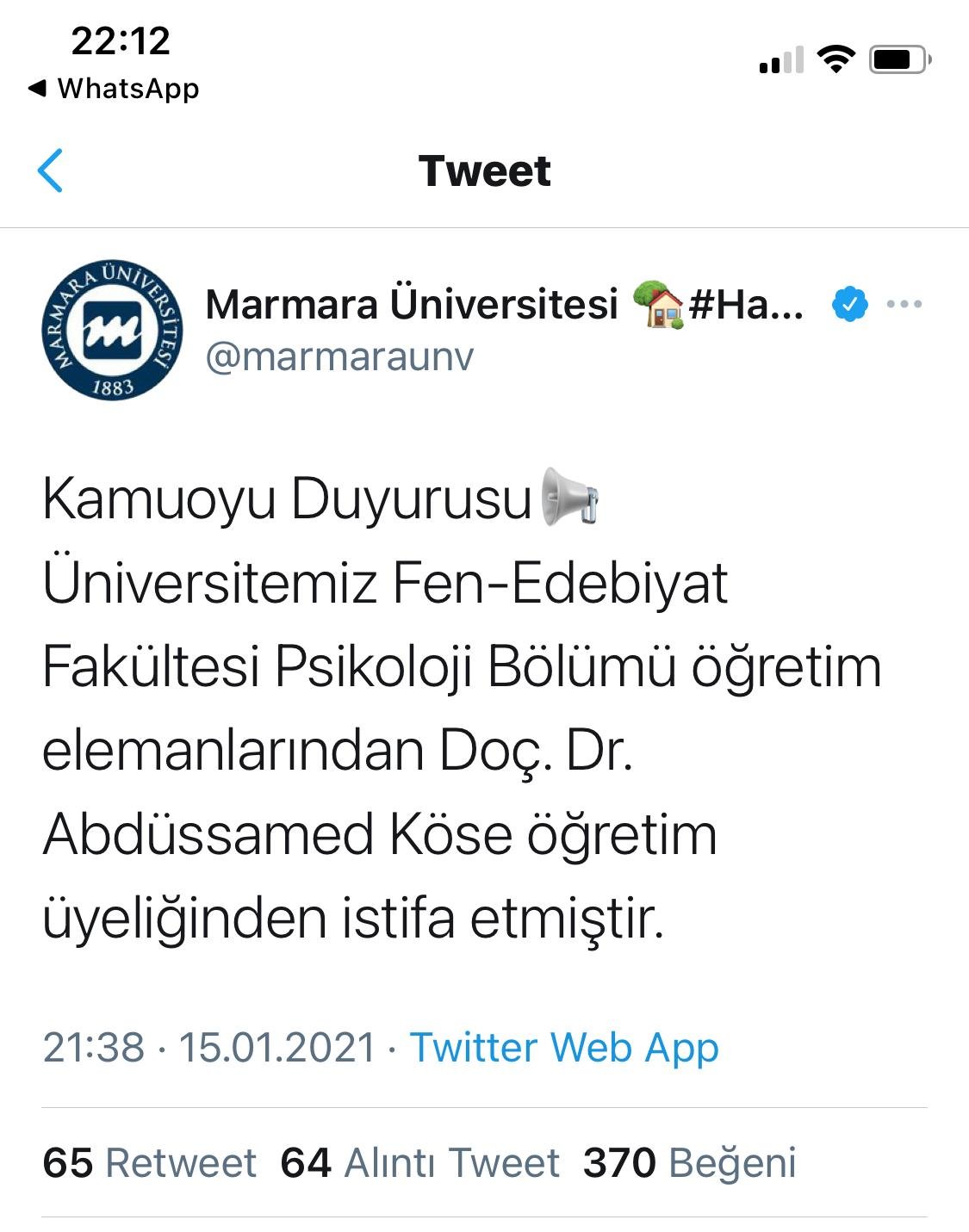 Akademisyen Doç. Dr. Abdüssamed Köse'nin ABD'nin Teksas eyaletinde çocuk istismarı suçundan hapis yatmasının ardından Türkiye’ye dönerek Marmara Üniversitesi’nde ‘Psikoloji Bölüm Başkanlığı’ görevini yürüttüğü haberi sonrası istifa haberi geldi.Akşam saatlerinde konuyla ilgili olarak Marmara Üniversitesi'nin sosyal medya hesabından bir paylaşım yapıldı. Üniversiteden yapılan açıklamada, “Üniversitemiz Fen-Edebiyat Fakültesi Psikoloji Bölümü öğretim elemanlarından Doç.Dr. Abdüssamed Köse öğretim üyeliğinden istifa etmiştir” denildi.