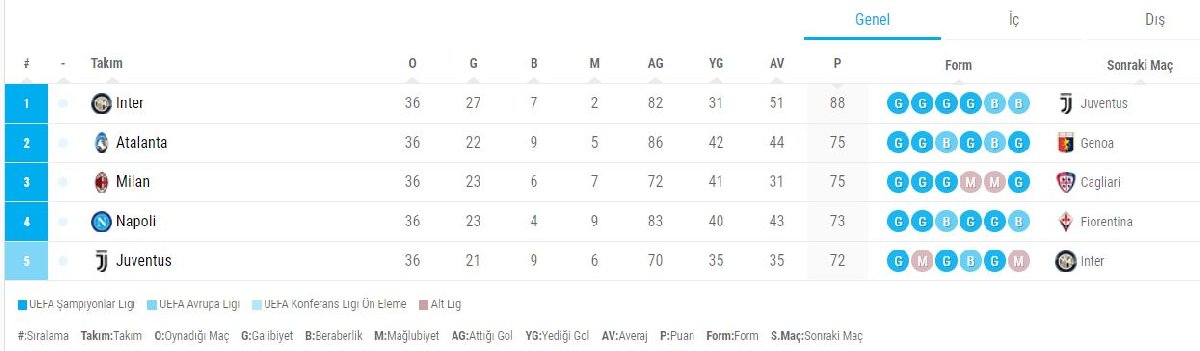 Bitime 2 hafta kala Şampiyonlar Ligi yarışı içinde kalan Juventus bu sonucun ardından puanını 72’ye çıkardı. Yarışın içinde olan Hakan Çalhanoğlu’nun takımı Milan da deplasmanda Torino’yu 7-0 mağlup ederek 75 puan yaptı. Juventus 15 Mayıs’ta şampiyon İnter ile karşı karşıya gelecek. İşte Serie A’daki puan durumu ve Şampiyonlar Ligi yarışındaki son durum…