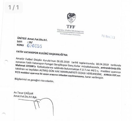 Efe Mehmet Aydın’ın, 18 Nisan 2019 tarihinde oynanan Fatih Vatanspor-Fomget Gençlikspor maçının ardından iki sporcuya şiddet uyguladığı iddia ediliyor. Karşılaşmadan sonra iki sporcu, kendilerine yarı çıplak bir vaziyette yedi saat boyunca şiddete maruz bıraktığı iddiasıyla Efe Mehmet Aydın hakkında suç duyurusunda bulunuyor.Mahkemesi devam eden Efe Mehmet Aydın, sporcuların şikayeti ve darp raporunu inceleyen TFF, teknik direktörü 60 gün boyunca hak mahrumiyeti cezası veriyor. Olay adli mercilere taşınıyor. Efe Mehmet Aydın’ın Kütahya 6. Asliye Ceza Mahkemesi'nde iki duruşması görülüyor. Üçüncü duruşmanın tarihi ise 27 Mayıs 2021 tarihinde…Kadına şiddet'e plaket veren ilk ülke olduk