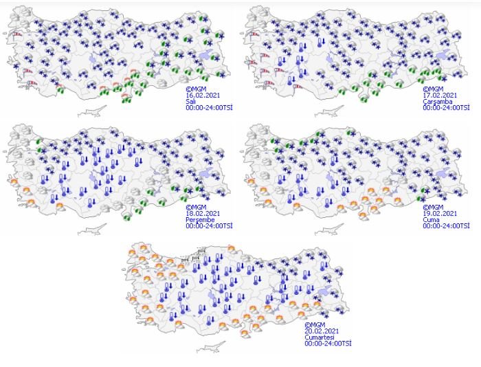 HER BÖLGEYE UYARI GELDİMeteoroloji Genel Müdürlüğü tarafından yapılan son değerlendirmelere göre; Ülkemiz genelinin parçalı ve çok bulutlu, Marmara'nın doğusu, Kuzey ve İç Ege, Akdeniz, İç Anadolu, Karadeniz ve Doğu Anadolu ile Gaziantep, Kilis, Adıyaman, Diyarbakır, Batman ve Siirt çevrelerinin yağışlı geçeceği tahmin ediliyor.Yağışların, Akdeniz kıyıları ile Güneydoğu Anadolu'nun yağış alan kesimlerinde yağmur, yağış alan diğer yerlerde karla karışık yağmur ve kar şeklinde olması bekleniyor. Yağışların, İç Anadolu'nun güney ve doğusu, Orta Karadeniz, Orta ve Doğu Akdeniz’in iç kesimleri ile Kocaeli, Sakarya, Giresun, Bingöl, Bitlis, Muş, Hakkari ve Şırnak çevrelerinde yoğun kar, Akdeniz kıyıları ile Kilis çevrelerinde kuvvetli yağmur şeklinde olması bekleniyor.Marmara bölgesi ile iç ve doğu kesimlerde buzlanma ve don olayı görüleceği tahmin ediliyor. Doğu Karadeniz'in iç kesimleri ile Doğu Anadolu'nun doğusunda çığ oluşma tehlikesi bulunmaktadır.İlginizi Çekebilir