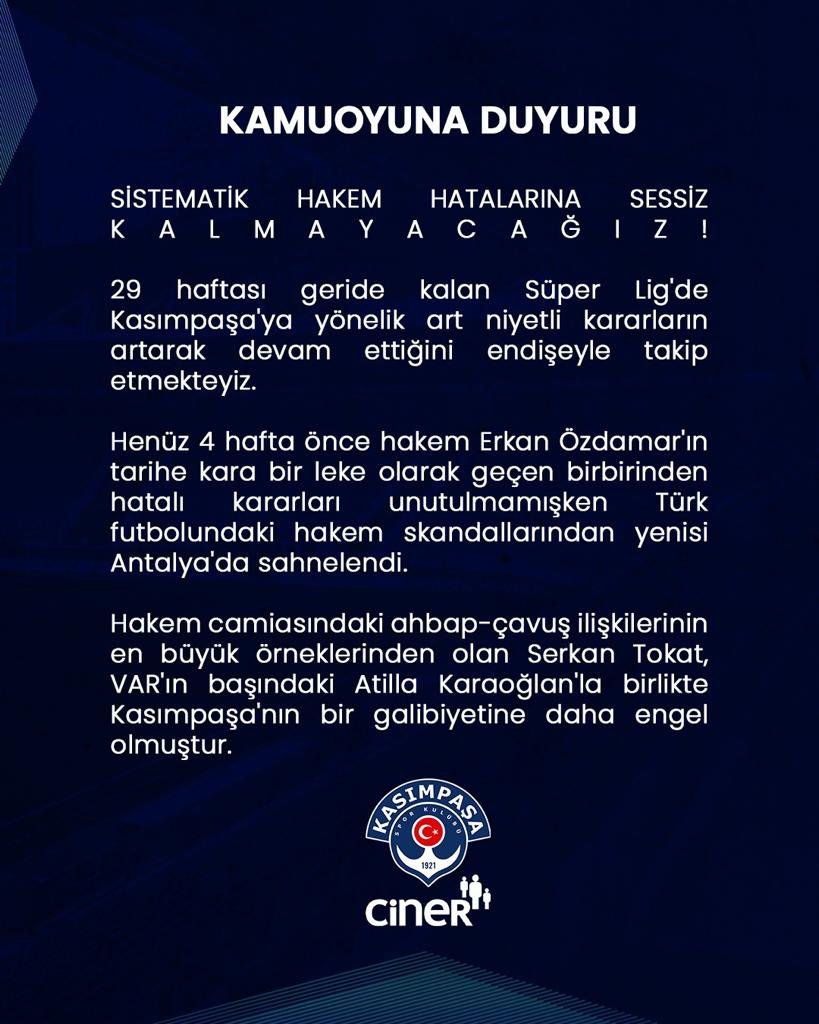 Kasımpaşa Kulübü, Antalyaspor maçının ardından resmi internet sitesinden bir açıklama yaparak hakem yönetimine tepki gösterdi. Kasımpaşa Kulübü, lacivert-beyazlı futbol takımının maçlarındaki hakem kararlarına tepki gösterdi.Kulüpten yapılan açıklamada, Süper Lig’in 29. haftasında Fraport TAV Antalyaspor ile oynanan karşılaşmadaki hakem yönetimine eleştiride bulunularak, şu ifadeler kullanıldı:“Sistematik hakem hatalarına sessiz kalmayacağız. 29 haftası geride kalan Süper Lig’de Kasımpaşa’ya yönelik art niyetli kararların artarak devam ettiğini endişeyle takip etmekteyiz. Henüz 4 hafta önce hakem Erkan Özdamar’ın tarihe kara bir leke olarak geçen birbirinden hatalı kararları unutulmamışken, Türk futbolundaki hakem skandallarından yenisi Antalya’da sahnelendi. Hakem camiasındaki ahbap-çavuş ilişkilerinin en büyük örneklerinden olan Serkan Tokat, VAR’ın başındaki Atilla Karaoğlan’la birlikte Kasımpaşa’nın bir galibiyetine daha engel olmuştur” ifadeleri kullanıldı.
