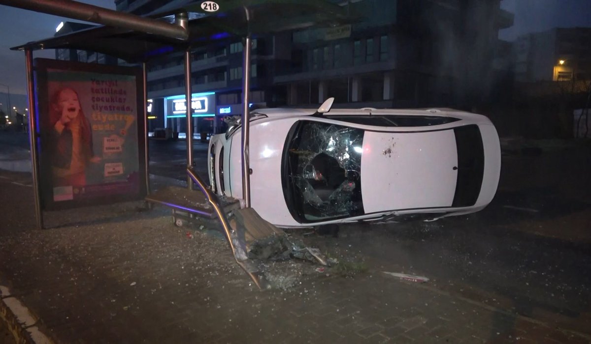 Foto: İHA / Kayganlaşan yolda kontrolden çıkan otomobil otobüs durağına çarpıp yan yattı.