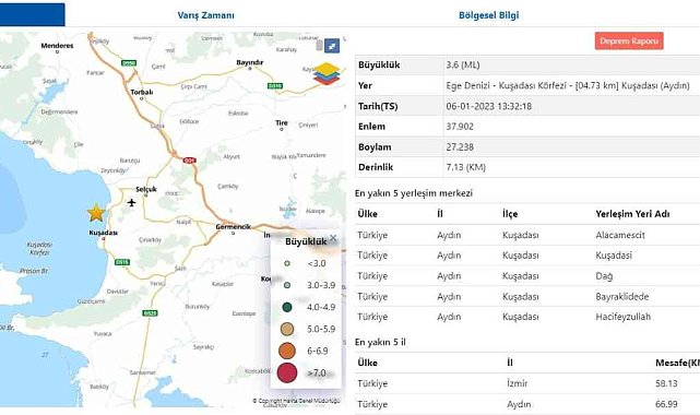 Kuşadası körfezi'nde 25 dakika içerisinde çeşitli büyüklüklerde 5 deprem meydana geldi.Afet ve Acil Durum Yönetimi Başkanlığı (AFAD) Deprem Dairesi Başkanlığı tarafından alınan bilgilere göre Ege Denizi Kuşadası Körfezi'nde 25 dakika içerisinde 5 deprem meydana geldi. Saat 13.32 ile 13.57 saatleri arasında büyüklüğü 1.5 ile 3.6 arasında değişen irili ufaklı 5 deprem meydana geldi. Saat 13.32'de meydana gelen 3.6 şiddetinde depremin yerin 7.13 km derinliğinde oluştuğu tespit edildi. Depremler, Kuşadası merkezinde hafif şekilde hissedilirken herhangi bir olumsuzluğun yaşanmadığı öğrenildi.