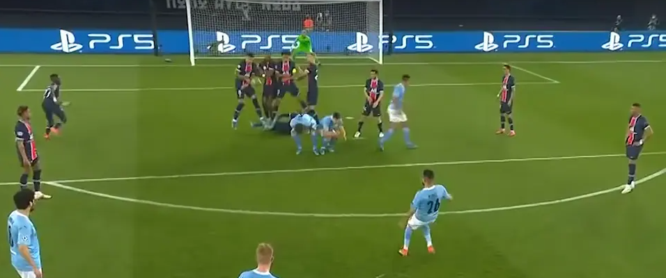 Şampiyonlar Ligi Yarı Final ilk maçında Manchester City'yi konuk eden Paris Saint Germain, sahadan 2-1'lik mağlubiyetle ayrıldı. City'ye zaferi getiren frikik golünde, PSG oyuncularının yaptığı hata geceye damga vurdu. Şampiyonlar Ligi Yarı Final ilk maçında sahasında Manchester City ile karşılaşan Paris Saint Germain, öne geçtiği maçı 2-1 kaybederek rövanş öncesi önemli bir avantajı kaybetti.Karşılaşmanın 15. dakikasında Marquinhos’un golüyle 1-0 öne geçen Paris ekibi, ilk yarıyı bu skorla üstün tamamladı. Ancak 64’te Kevin de Bruyne ile skora eşitliği getiren İngiliz ekibi, 71’de Riyad Mahrez’in frikik golüyle 2-1 üstünlüğü ele geçirdi ve maçı da bu skorla kazandı.Manchester City’ye galibiyeti getiren frikik golünde, PSG oyuncularının kurduğu barajda yapılan hata gecenin en çok konuşulan olayı oldu. PSG ceza yayı önünde kazanılan frikik için Kevin de Bruyne, İlkay Gündoğan ve Riyad mahrez topun önüne geçti. Dört futbolcuyla baraj kuran PSG’de, Veratti barajın arkasında yere yatarak yerden vuruşa engel olmak istedi.