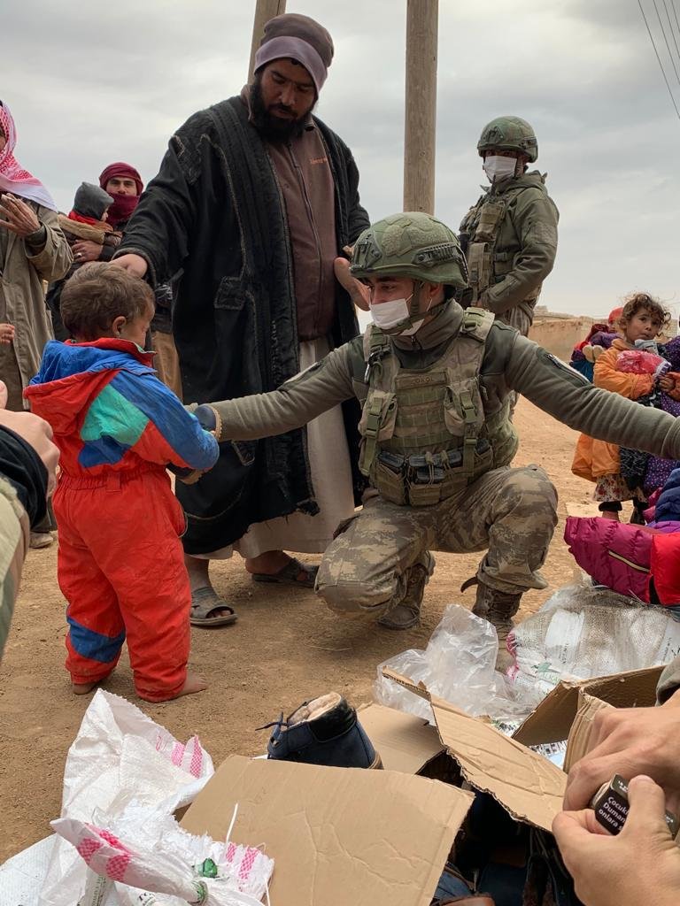 Sosyal medya hesabından açıklamada bulunan Milli Savunma Bakanlığı (MSB), “En büyük moral ve motivasyon kaynağımız; mutluluk dolu yüzlerdir. Mehmetçiklerimiz, Barış Pınarı bölgesinde 64 Suriyeli kardeşimize mont, bot, çorap, kazak ve eşofmandan oluşan kıyafet yardımı yaptı. Engelli bir Suriyeli vatandaşa da tekerlekli sandalye hediye edildi” bilgisini paylaştı.