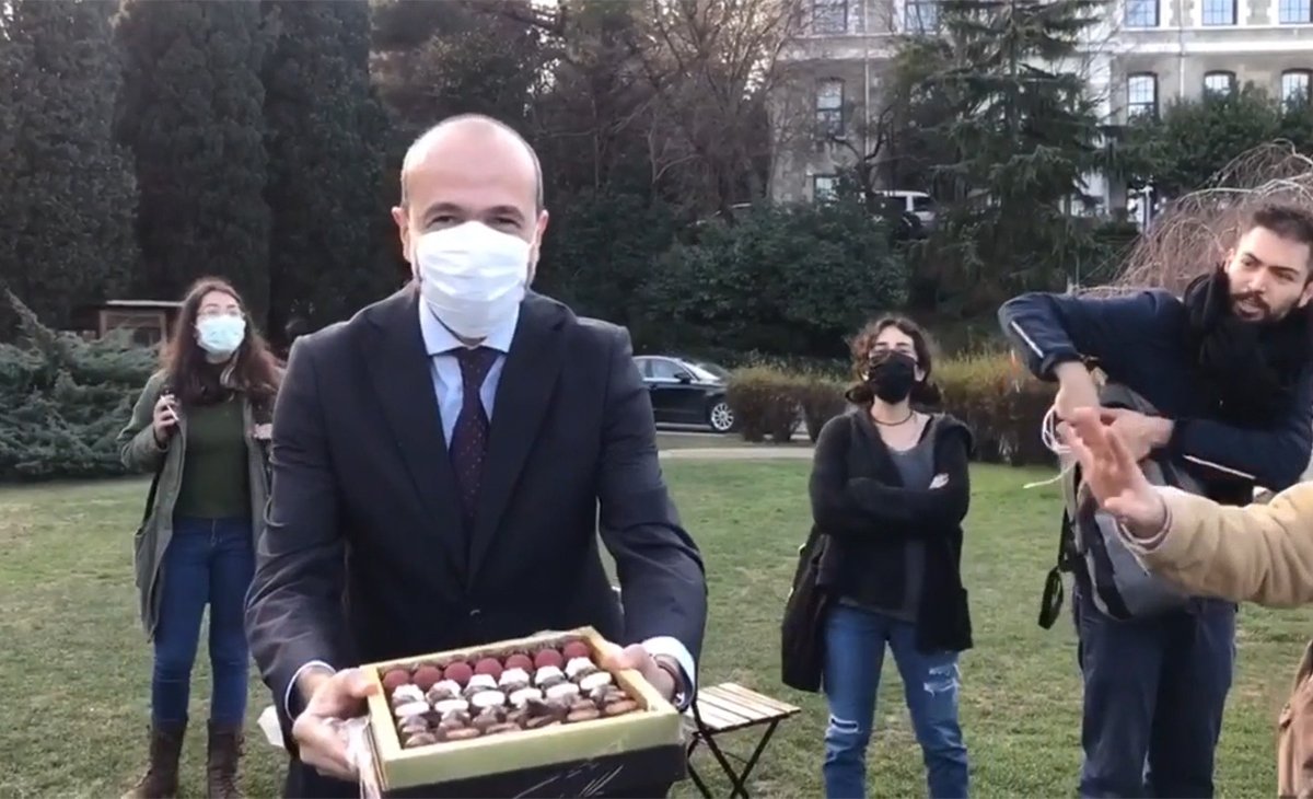 AKP’li rektör Melih Bulu’nun atanmasına yönelik Boğaziçi Üniversitesi içindeki protestolar devam ediyor.Bugün öğrencilerin eylemine gelen bir kişi rektör Melih Bulu’nun talimatıyla çikolata ikram etmek istedi.İkramı reddeden öğrencilere ‘canım’ diye seslenen kişiye öğrenciler, “Canım diyecek bir durum yok. Bizim aramızda bir kavga var şu anda. Bizim arkadaşlarımızı tutuklattınız bu onun çikolatası mı?” diye tepki gösterdi.