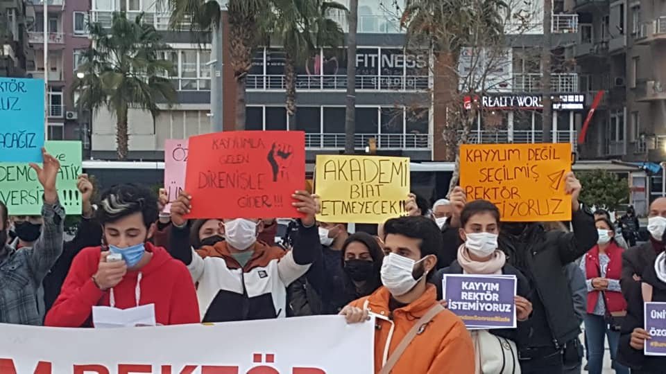 Mersin'de bir grup üniversite öğrencileri, kayyum rektöre karşı günlerdir direnen Boğaziçi Üniversitesi öğrencilerine destek vermek için eylem yaptı. “Kayyum rektör istemiyoruz” pankartı açan öğrenciler, üniversiteleri son kayyum gidene kadar savunacaklarını söyledi.Adnan Menderes Bulvarı üzerindeki Özgecan Barış Meydanı’nda toplanan öğrenciler “Kayyum rektör istemiyoruz”, “Akademi biat etmeyecek”, “Kayyum değil seçilmiş rektör istiyoruz” şeklinde pankart açtı. Çevik Kuvvet ve Güvenlik Şube Müdürlüğü ekipleri ise çevrede geniş güvenlik önlemi aldı. Mersin Üniversitesi öğrencisi Onur Gök burada yaptığı açıklamada, Boğaziçi Direnişi'nin yanında olduklarını göstermek ve son kayyum gidene kadar üniversitelerini savunacaklarını dile getirmek için toplandıklarını söyledi.