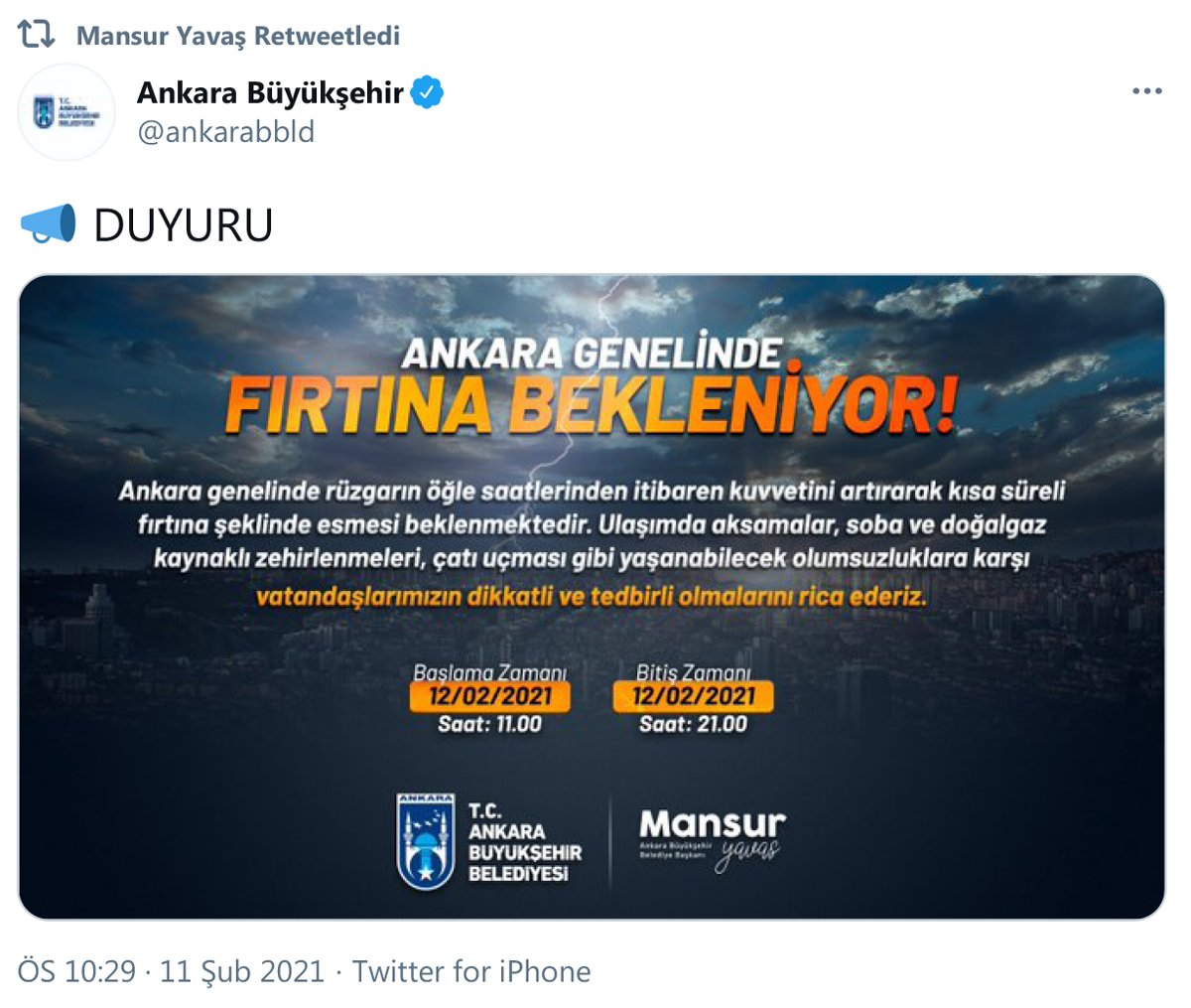 Meteoroloji Genel Müdürlüğü (MGM), kuvvetli rüzgar ve fırtına uyarısı yaptı.Uyarıda “12.02.2021 Cuma günü öğle saatlerinden itibaren Orta ve Doğu Karadeniz ile Ankara, Kastamonu ve Sinop çevrelerinde batı ve güneybatı zamanla kuzeybatı yönlerden kuvvetli rüzgar ve kısa süreli fırtına (60-90 km/sa) beklendiğinden meydana gelebilecek olumsuzluklara karşı dikkatli ve tedbirli olunmalıdır” ifadeleri kullanıldı.ANKARA BÜYÜKŞEHİR BELEDİYESİ DE UYARDIAnkara Büyükşehir Belediyesi, kent genelinde fırtına beklendiğini belirtti.Belediyeden yapılan açıklamada şu ifadeler kullanıldı:* Ankara genelinde rüzgarın öğle saatlerinden itibaren kuvvetini artırarak kısa süreli fırtına şeklinde esmesi beklenmektedir.* Ulaşımda aksamalar, soba ve doğalgaz kaynaklı zehirlenmeleri, çatı uçması gibi yaşanabilecek olumsuzluklara karşı vatandaşlarımızın dikkatli ve tedbirli olmalarını rica ederiz.