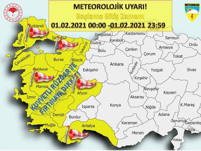 Meteoroloji Genel Müdürlüğü, İstanbul için kuvvetli rüzgar ve fırtına uyarısında bulundu. Meteoroloji’den yapılan açıklamada şu ifadelere yer verildi;“Yapılan değerlendirmelere göre; bu gece saatlerinden itibaren Kıyı Ege ve Marmara’nın batısında güneyden kuvvetli esmeye başlayacak rüzgarların; zamanla Ege genelinde güney ve güneydoğudan, Marmara’da ise güney ve güneybatıdan kuvvetli (40-60 km/saat) ve yer yer fırtına (60-75 km/saat) şeklinde esmesi beklendiğinden meydana gelebilecek çatı uçması, soba ve baca gazı zehirlenmesi, ağaç ve direk devrilmesi ile ulaşımda aksamalar gibi olumsuzluklara karşı dikkatli ve tedbirli olunmalıdır.”