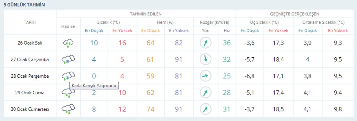 Meteoroloji Genel Müdürlüğü tarafından yapılan son değerlendirmelere göre ükemizin kuzey ve batı kesimlerinin parçalı, yer yer çok bulutlu, Marmara, Ege, Batı Akdeniz, Batı Karadeniz (Sinop dışında), Eskişehir, Çankırı, Ankara, Kırıkkale, Kırşehir, Nevşehir ve Çorum çevrelerinin sağanak, Ege ve Batı Akdeniz kıyı kesimlerinin yer yer gök gürültülü sağanak yağışlı, diğer yerlerin parçalı az bulutlu geçeceği tahmin ediliyor.Yağışların Muğla çevrelerinde kuvvetli (21-50 kg/m²), Antalya’nın doğu kesimlerinde kuvvetli ve yer yer çok kuvvetli (51-75 kg/m²) olması bekleniyor. İç Anadolu’nun doğusu ile Doğu Anadolu’da kuvvetli buzlanma ve don olayı bekleniyor.Hava sıcaklığının Doğu Anadolu’nun doğusunda mevsim normallerinin altında, diğer bölgelerimizde mevsim normallerinin üzerinde seyretmesi beklenirken rüzgarın genellikle güneyli yönlerden hafif, ara sıra orta kuvvette; Karadeniz’de kuvvetli (40-60 km/sa), Ege, Marmara, Batı Akdeniz'in iç kesimlerinde kuvvetli rüzgar ve fırtına (50-80 km/sa) şeklinde eseceği tahmin ediliyor.İSTANBUL’A İKİ GÜN İÇİN UYARIMeteoroloji’nin beş günlük hava tahminine göre İstanbul’da 27 Ocak Çarşamba ve 28 Ocak Perşembe günleri karla karışık yağmur etkili olacak.En düşük hava sıcaklığının çarşamba günü 4, perşembe günü ise sıfır derece olması bekleniyor.