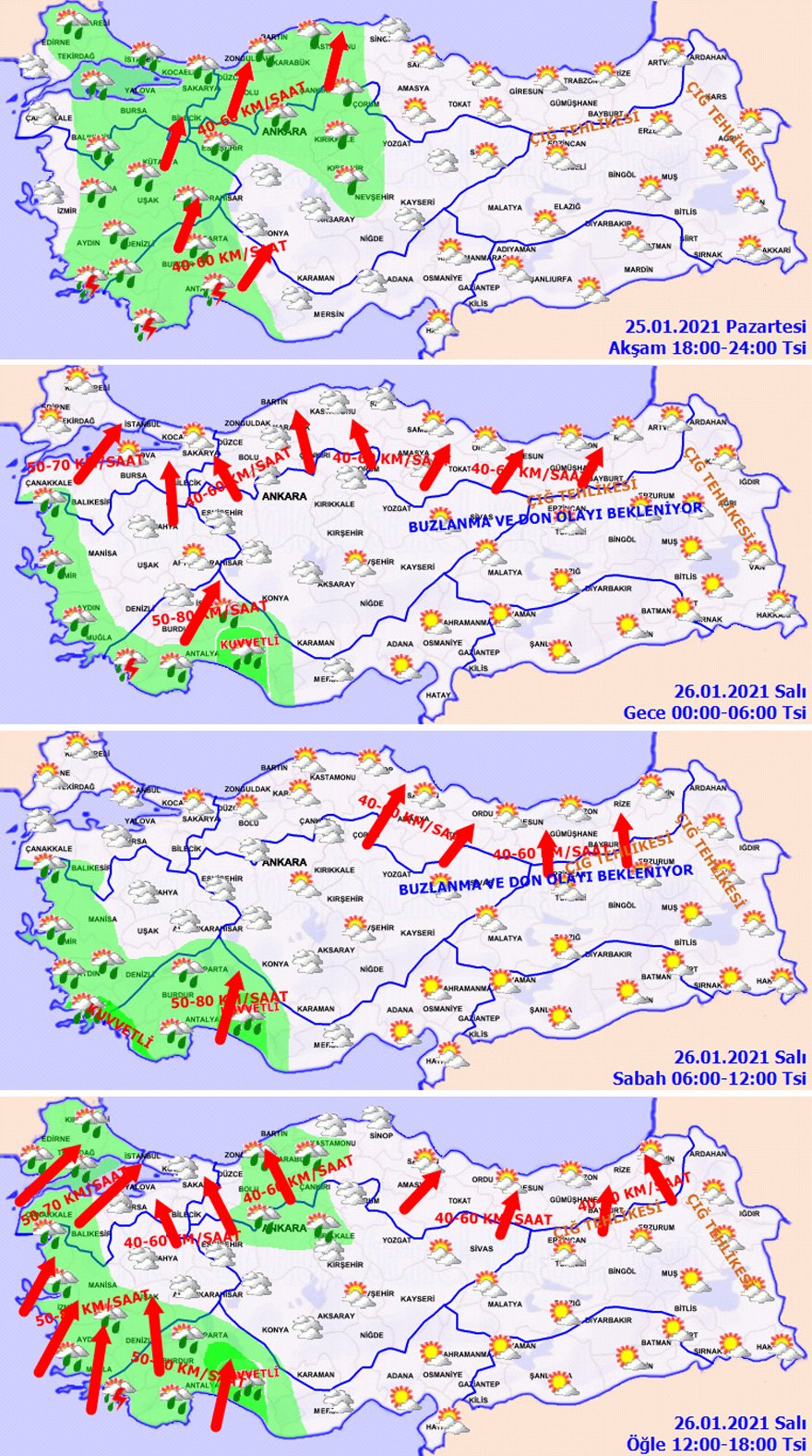 KUVVETLİ YAĞIŞ, RÜZGAR, ÇIĞ, DON…Meteoroloji, vatandaşları kuvvetli buzlanma, don, çığ, kuvvetli rüzgar ve yağışa karşı da uyardı.Meteoroloji’nin uyarılarında şu ifadelere yer verildi:* İç Anadolu’nun doğusu ve Doğu Anadolu’da yer yer kuvvetli buzlanma ve don olayı beklendiğinden yaşanabilecek olumsuzluklara (ulaşımda aksamalar vb) karşı dikkatli ve tedbirli olunmalıdır.* Doğu Karadeniz’in iç kesimleri ile Doğu Anadolu’nun doğusunda yüksek kar örtüsünün bulunduğu dik yamaçlarda çığ oluşma riski olmasından yaşanabilecek olumsuzluklara karşı dikkatli ve tedbirli olunmalıdır.* Yapılan son değerlendirmelere göre; Karadeniz’de kuvvetli (40-60 km/sa), Ege, Marmara, Batı Akdeniz'in iç kesimlerinde kuvvetli rüzgar ve fırtına (50-80 km/sa) şeklinde esmesi beklendiğinden oluşturabileceği ulaşımda aksamalar, soba ve doğalgaz kaynaklı zehirlenmeler, çatı uçması gibi olumsuzluklara karşı dikkatli ve tedbirli olunmalıdır.* Muğla çevreleri ile Antalya’nın doğu kesimlerinde yerel olarak kuvvetli (20-50 kg/m2) sağanak ve gök gürültülü sağanak yağış beklendiğinden ulaşımda aksamalar, su baskını, sel, yıldırım gibi olumsuzluklara karşı dikkatli ve tedbirli olunmalıdır.BÖLGELERDE HAVA DURUMUMeteoroloji’nin bölge bölge hava durumu tahmininde ise şöyle denildi:* Marmara: Parçalı ve çok bulutlu, bölge genelinin sağanak yağışlı geçeceği tahmin ediliyor. Rüzgarın güney yönlerden kuvvetli ve fırtına (50-70 km/sa) şeklinde esmesi bekleniyor.* Ege: Parçalı ve çok bulutlu, bölge genelinin sağanak ve gök gürültülü sağanak yağışlı geçeceği tahmin ediliyor. Yağışların, Muğla çevrelerinde yarın (Salı) sabah saatlerinde yerel olarak kuvvetli olması bekleniyor. Rüzgarın güney yönlerden kuvvetli ve fırtına (50-80 km/sa) şeklinde esmesi bekleniyor.* Akdeniz: Parçalı bulutlu, Batı Akdeniz’in yer yer çok bulutlu ve sağanak ve gök gürültülü sağanak yağışlı geçeceği tahmin ediliyor. Yağışların Antalya’nın doğusunda yerel olarak kuvvetli ve yer yer çok kuvvetli (51-75 kg/m2) olması bekleniyor. Rüzgarın iç kesimlerinde güney yönlerden kuvvetli ve fırtına (50-80 km/sa) şeklinde esmesi bekleniyor.* İç Anadolu: Parçalı, kuzeyi yer yer çok bulutlu, Ankara, Eskişehir, Çankırı, Kırşehir, Nevşehir ve Kırıkkale çevrelerinin sağanak yağışlı geçeceği tahmin ediliyor. Bölge’nin doğusunda gece ve sabah saatlerinde buzlanma ve don olayları bekleniyor.* Batı Karadeniz: Parçalı ve çok bulutlu, bölge genelinin sağanak yağışlı geçeceği tahmin ediliyor. Rüzgarın güney yönlerden kuvvetli (40-60 km/sa) şeklinde esmesi bekleniyor.* Orta ve Doğu Karadeniz: Parçalı ve çok bulutlu, bu akşam saatlerinde Çorum çevrelerinin sağanak yağışlı geçeceği tahmin ediliyor. Rüzgarın güney yönlerden kuvvetli (40-60 km/sa) şeklinde esmesi bekleniyor. Bölgenin doğusunun yüksek kar örtüsü bulunan dik yamaçlarında çığ tehlikesi bulunmaktadır.* Doğu Anadolu: Parçalı ve az bulutlu geçeceği tahmin ediliyor. Bölge genelinde kuvvetli buzlanma ve don olayı bekleniyor. Bölgenin doğusunun yüksek kar örtüsü bulunan dik yamaçlarında çığ tehlikesi bulunmaktadır.