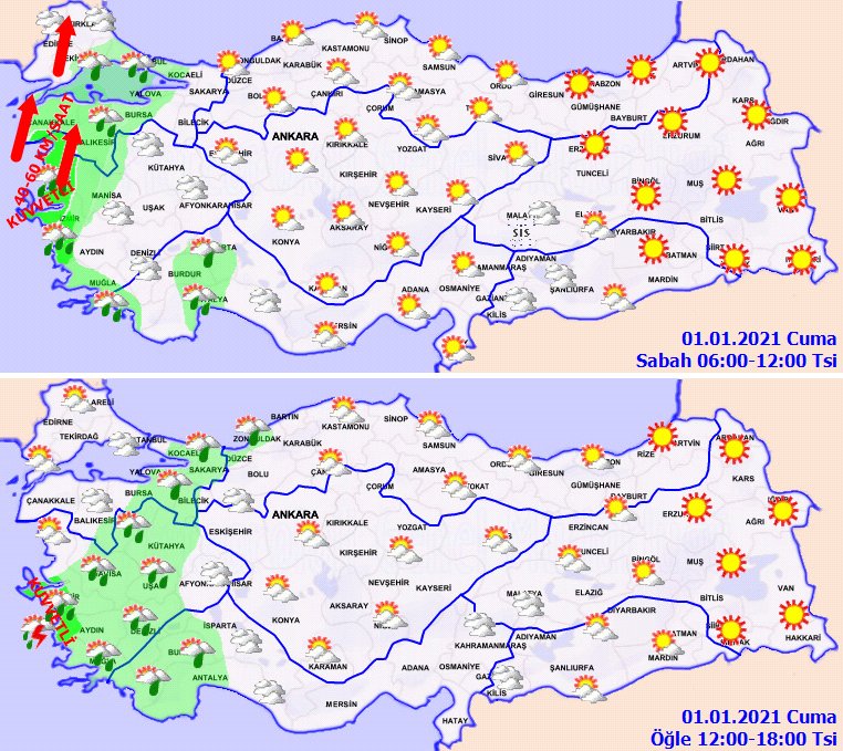 Meteoroloji Genel Müdürlüğü tarafından yapılan son değerlendirmelere göre ülkemizin batı kesimlerinin parçalı ve yer yer çok bulutlu, Marmara, Ege, Batı Akdeniz ile Düzce ve Zonguldak çevrelerinin yağmur ve sağanak yağışlı, diğer yerlerin az bulutlu ve açık geçeceği tahmin ediliyor.Ege kıyılarında yer yer gök gürültülü sağanak şeklinde görülecek yağışların Muğla, İzmir ve Çanakkale çevreleri ile Aydın’ın kıyı, Balıkesir’in batı çevrelerinde kuvvetli olması bekleniyor. Gece ve sabah saatlerinde iç ve doğu bölgelerde pus ve sis hadisesi ile birlikte yer yer buzlanma ve don olayı bekleniyor.Hava sıcaklığında önemli bir değişiklik olmayacağı, ülkemiz genelinde mevsim normallerinin üzerinde seyretmeye devam edeceği tahmin edilirken rüzgarın genellikle güney ve güneybatı yönlerden hafif, ara sıra orta kuvvette, Marmara’nın batısı ile Kuzey Ege kıyılarında güneyli yönlerden zaman zaman kuvvetli (40-60 km/saat) olarak esmesi bekleniyor.