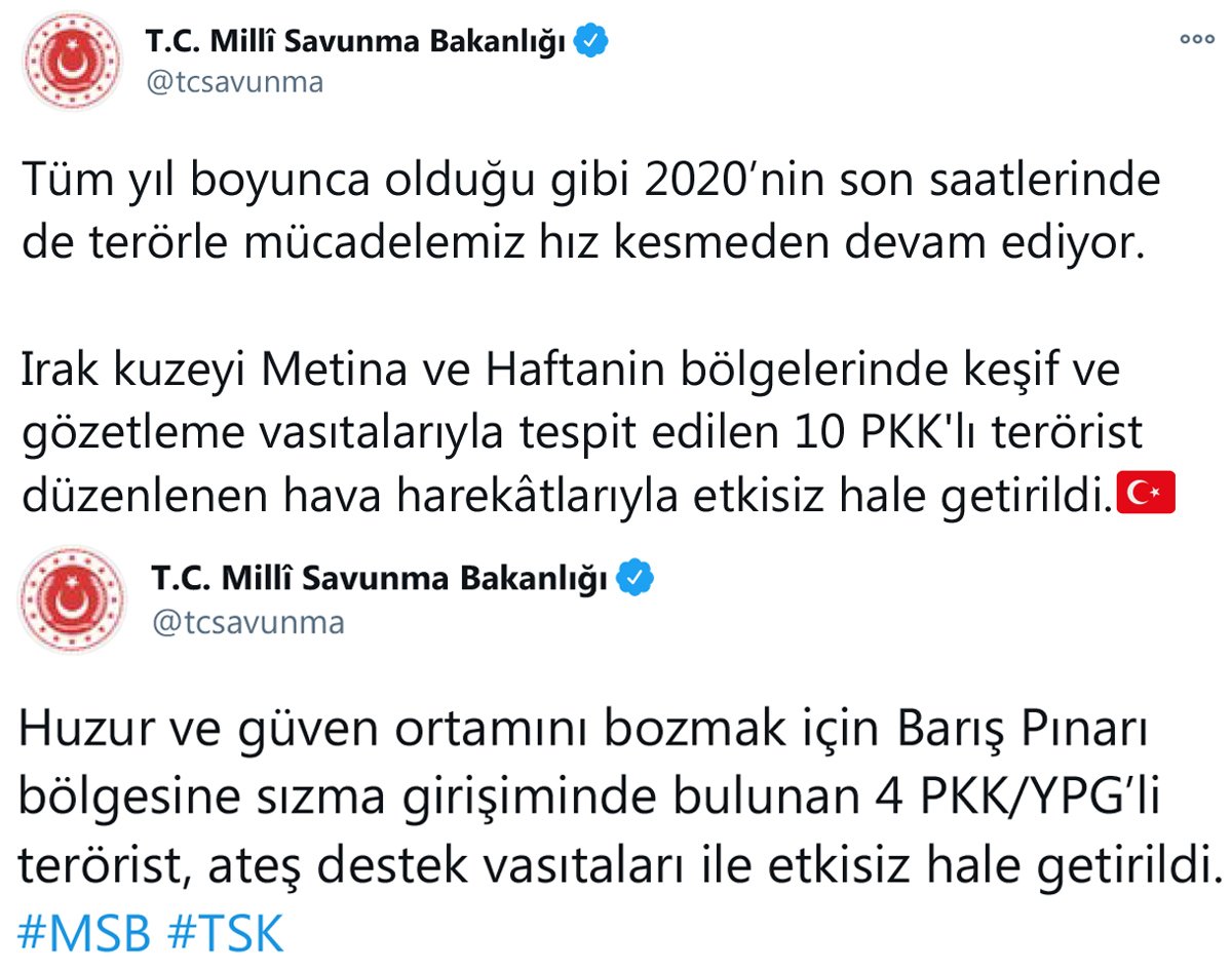 Milli Savunma Bakanlığı (MSB), sosyal medya hesabından 14 teröristin etkisiz hale getirildiğini açıkladı.MSB’nin açıklamasında şu ifadeler kullanıldı:* Tüm yıl boyunca olduğu gibi 2020'nin son saatlerinde de terörle mücadelemiz hız kesmeden devam ediyor.* Huzur ve güven ortamını bozmak için Barış Pınarı bölgesine sızma girişiminde bulunan 4 PKK/YPG'li terörist, ateş destek vasıtaları ile etkisiz hale getirildi.* Irak kuzeyi Metina ve Haftanin bölgelerinde keşif ve gözetleme vasıtalarıyla tespit edilen 10 PKK’lı terörist düzenlenen hava harekâtlarıyla etkisiz hale getirildi.
