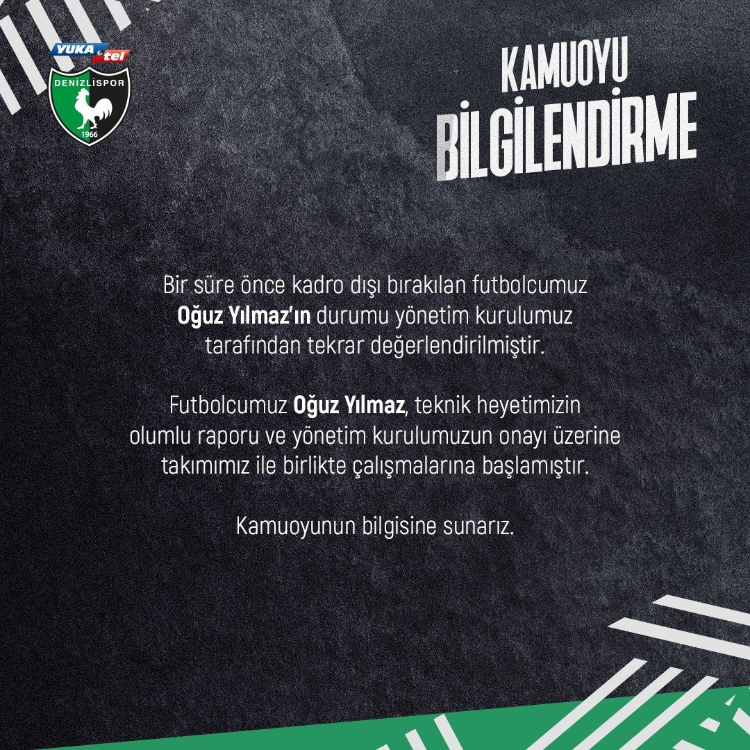 Yeşil-siyahlı kulüp tarafından yapılan açıklamada “Bir süre önce kadro dışı bırakılan futbolcumuz Oğuz Yılmaz'ın durumu yönetim kurulumuz tarafından tekrar değerlendirilmiştir. Futbolcumuz Oğuz Yılmaz, teknik heyetimizin olumlu raporu ve yönetim kurulumuzun onayı üzerine takımımız ile birlikte çalışmalarına başlamıştır. Kamuoyunun bilgisine sunarız” denildi.İlginizi Çekebilir