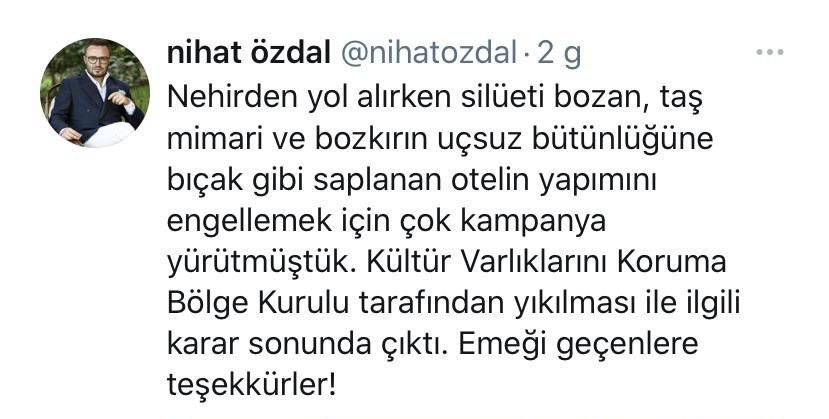Özdal, son olarak sosyal medya hesabından “Nehirden yol alırken silueti bozan, taş mimari ve bozkırın uçsuz bütünlüğüne bıçak gibi saplanan otelin yapımını engellemek için çok kampanya yürütmüştük. Kültür Varlıklarını Koruma Bölge Kurulu tarafından yıkılmasıyla ilgili karar sonunda çıktı. Emeği geçen herkese teşekkürler” ifadelerini kullanmıştı. (İHA)