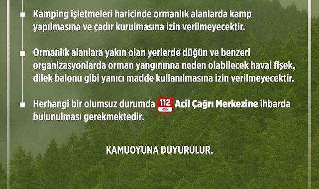 Rize'de orman yangınlarının önüne geçilmesi amacıyla ormanlık alanlara giriş-çıkışların ağustos ayı sonuna kadar yasaklandığı duyuruldu.Rize Valiliği, orman yangınlarının önüne geçilmesi amacıyla ormanlık alanlara giriş-çıkışların yasaklandığını duyurdu. Rize Valiliğinden yapılan açıklamada, "Orman yangını için riskli bölgelerdeki ormanların çevresinde ateş yakılması ve orman alanlarına girişler 31 Ağustos 2022 tarihine kadar yasaklanmıştır. Kamping işletmeleri haricinde ormanlık alanlarda kamp yapılmasına ve çadır kurulmasına izin verilmeyecektir. Ormanlık alanlara yakın olan yerlerde düğün ve benzeri organizasyonlarda orman yangınına neden olabilecek havai fişek, dilek balonu gibi yanıcı madde kullanılmasına izin verilmeyecektir. Herhangi bir olumsuz durumda 112 Acil Çağrı Merkezi'ne ihbarda bulunulması gerekmektedir" denildi.
