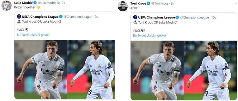 Toni Kroos’a destek veren Luka Modrid ise ‘Birlikte daha iyiyiz’ şeklinde paylaşımda bulundu. İkilinin o ankete karşı gösterdiği tavır sonrası Şampiyonlar Ligi hesabı paylaşımı değiştirdi. Modric ve Toni Kroos’un birlikte yan yana çekilen fotoğrafını paylaşan resmi hesap, ”Luka Modric ve Toni Kroos… Şampiyonlar Ligi tarihinin en iyi orta saha ikilisi olabilir mi?” diye sordu.Luka Modrić & Toni Kroos…
