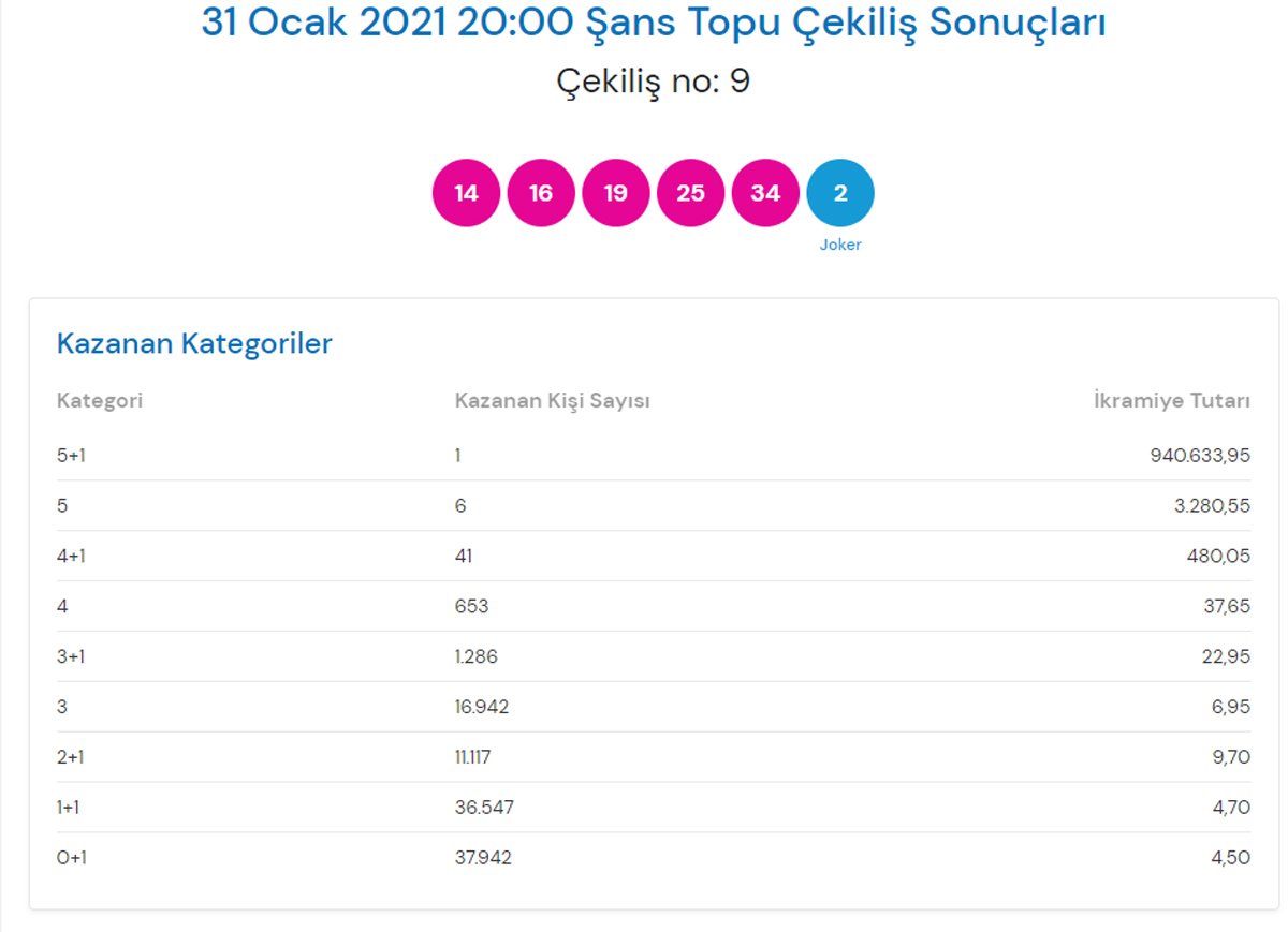 Şans Topu’nda büyük ikramiyeyi kazanmak için 1 ile 34 arasındaki beş rakamın ve 1 ile 14 arasındaki bir rakamın sıra gözetilmeksizin doğru tahmin edilmesi gerekiyor.ŞANS TOPU SONUÇLARIŞans Topu'nun bu akşam canlı olarak gerçekleştirilen 8. çekilişinde şanslı numaralar şu şekilde oldu: 14-16-19-25-34-joker 2