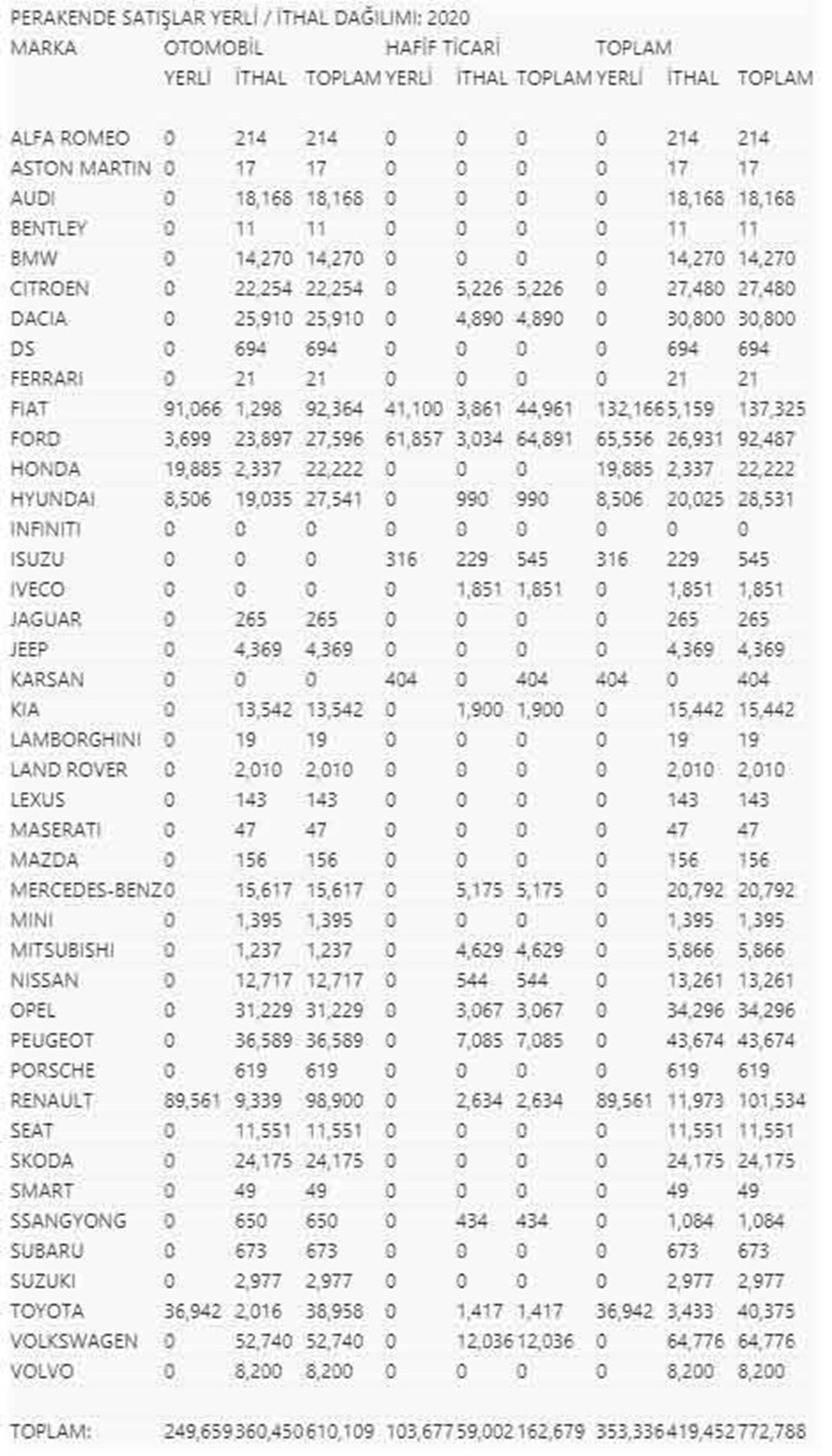 Toplam 772 bin 788 adetlik 2020 yılı pazarında ise Fiat, Renault, Toyota, Honda, Hyundai, Ford, Karsan ve Isuzu markalarının öncülüğünde yerli üretim araç satışı 353 bin 336, ithal araç satışı da 419 bin 452 olarak belirlendi.