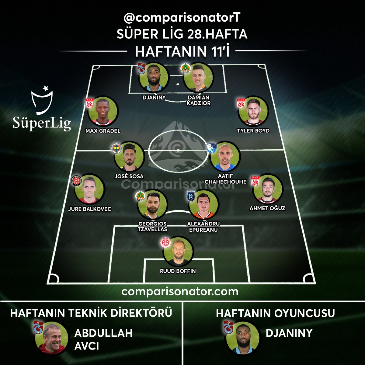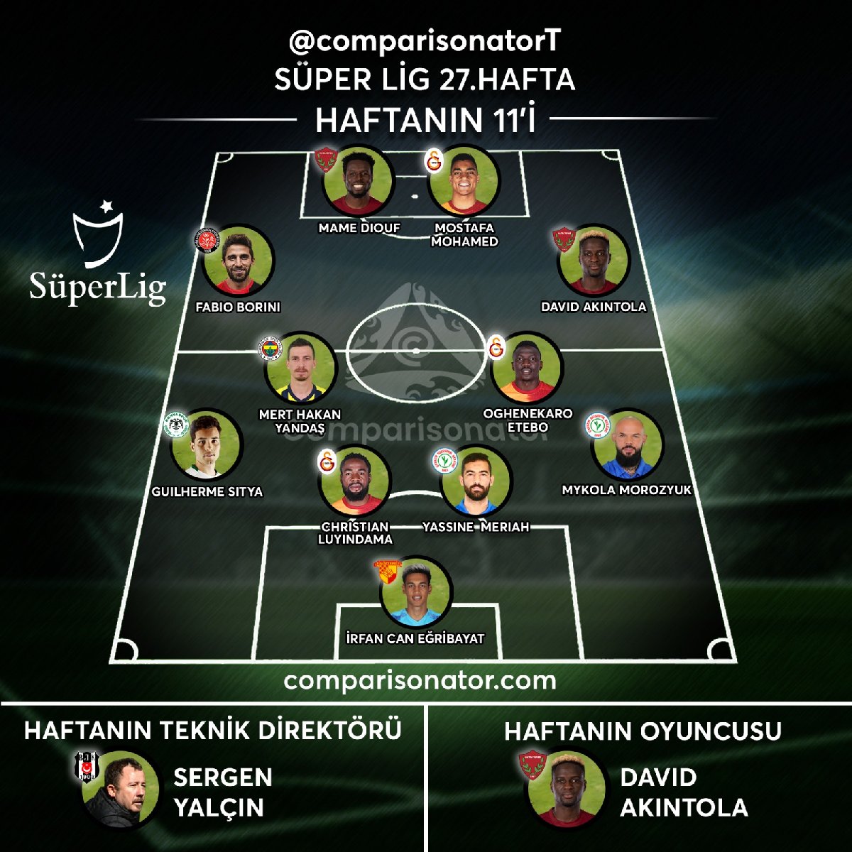 Haftanın Teknik Direktörü – Sergen YalçınComparisonator platformuna verilerine göre Sergen hocanın enteresan değişimleri dikkat çekti. Defansif oyundan ziyade ofansif verilerle oluşan geçmiş performansı yer değiştirdi. Özellikle 84 total top kazanımı ile bu haftayı zirvede kaparken, rakip sahada kazanılan topları da 20 saniyede şuta dönüştürerek kaleye gitmede aldığı liderlik önemliHaftanın Futbolcusu – David AkintolaBirebirlerde ve kazanılan birebirlerde Akintola çok önemli bir yere sahip. Bunu zaten sıkça haftanın 11'ine girerek başarıyor. 27 haftanın hücüm verilerinin tamamına yakınında 1. geldi. Attığı 2 golün yanısıra kaleye attığı 9 şutun 4'ünde isabet gördü. Ceza sahasında da 10 defa topla buluşarak kanatlar arasında neredeyse rekor kırdı.