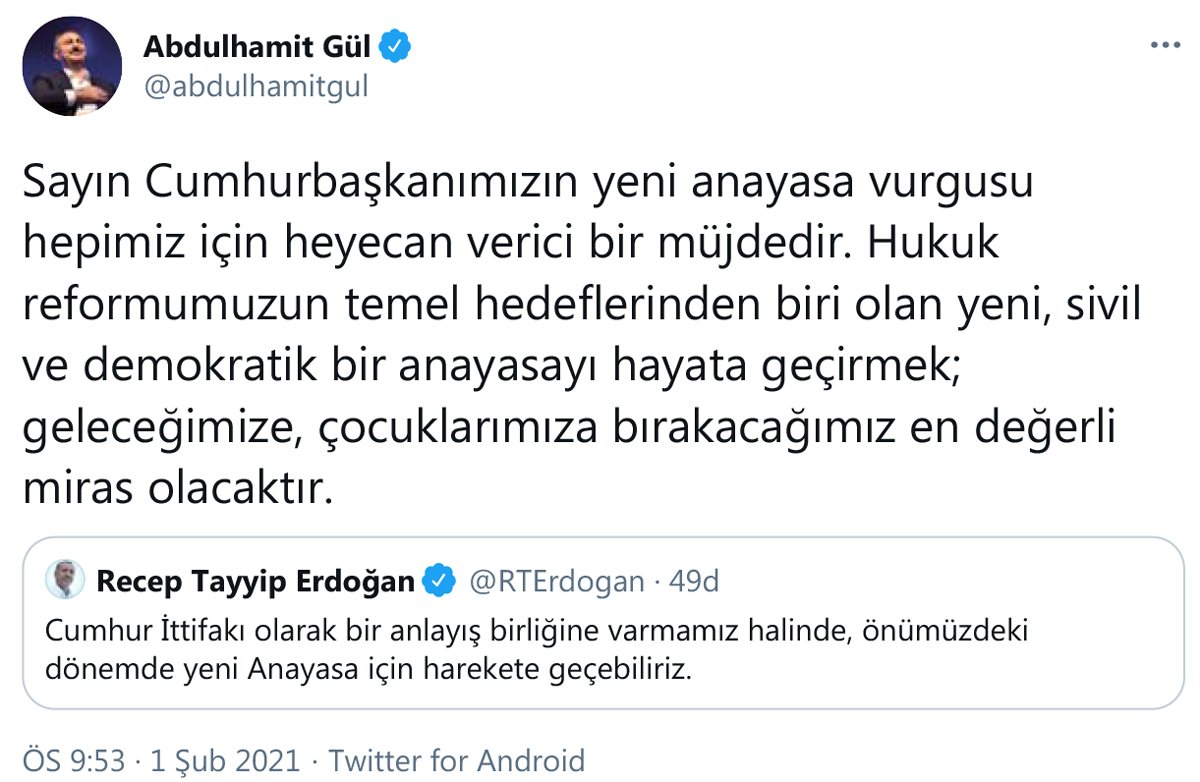 Cumhurbaşkanı Recep Tayyip Erdoğan, Kabine toplantısının ardından yaptığı açıklamada “Belki de şimdi Türkiye'nin yeni bir anayasayı tartışma vakti gelmiştir” demişti.“HEYECAN VERİCİ BİR MÜJDEDİR”Adalet Bakanı Abdulhamit Gül de sosyal medya hesabından Erdoğan’ın açıklamasıyla ilgili bir paylaşım yaptı.Bakan Gül, “Sayın Cumhurbaşkanımızın yeni anayasa vurgusu hepimiz için heyecan verici bir müjdedir. Hukuk reformumuzun temel hedeflerinden biri olan yeni, sivil ve demokratik bir anayasayı hayata geçirmek; geleceğimize, çocuklarımıza bırakacağımız en değerli miras olacaktır” ifadelerini kullandı.“TARTIŞMA VAKTİ GELMİŞTİR”Erdoğan ise açıklamasında şunları belirtmişti:* Esasen sorunların kaynağının 1960'tan beri hep darbeciler tarafından yapılan anayasalar olduğu açıktır. Ne kadar değiştirirsek değiştirelim bu vesayet izini silmek mümkün olmuyor.* Meclis’te sandalye sayılarına bakmadan tüm partilerden eşit temsilci ile başlatılan çalışmalar CHP’nin süreci tıkaması ve uzlaşmaz tutumu sebebiyle maalesef sonuca ulaşamamıştı. Ülkemizin bu önemli fırsatı kaçırmış olmasından dolayı üzüntülüyüz.* Belki de şimdi Türkiye’nin yeni bir anayasayı tartışma vakti gelmiştir. Anayasa çalışması gizli saklı mahfillerde terör örgütü ile irtibatlı kesimlerin gölgesinde ülkesi ile zihni kalbi bağlantısı kopuk isimlerle yürütülebilecek bir iş değildir.* Bu çalışmanın milletin gözü önünde ve onun temsilcilerinin tamamının katılımıyla şeffaf bir şekilde gerçekleştirilmesi ortaya çıkan metnin de mutlaka milletin takdirine sunulması gerekir.* Cumhur İttifakı'ndaki ortağımızla bu konuda bir anlayış birliğine varmamız halinde önümüzdeki dönemde yeni anayasa için harekete geçebiliriz.