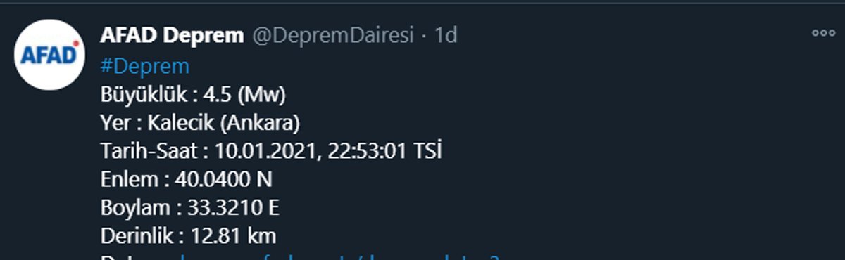 AFAD: GELİŞMELERİ TAKİP EDİYORUZDeprem sonrası olumsuz bir ihbarın olmadığını duyuran AFAD, “Geçmiş olsun Ankara. Kalecik ilçesinde meydana gelen deprem sonrası, an itibarıyla, olumsuz bir ihbarın bulunmadığı bilgisi alınmıştır. Gelişmeleri takip ediyoruz” açıklamasında bulundu.