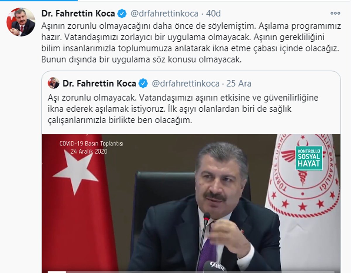 Sağlık Bakanı Fahrettin Koca, coronaya karşı geliştirilen aşılarla ilgili Twitter hesabından açıklama yaptı.Eski açıklamalarından birini alıntılayarak açıklama yapan Bakan Koca, şu ifadeleri kullandı;*Aşının zorunlu olmayacağını daha önce de söylemiştim. Aşılama programımız hazır. Vatandaşımızı zorlayıcı bir uygulama olmayacak.*Aşının gerekliliğini bilim insanlarımızla toplumumuza anlatarak ikna etme çabası içinde olacağız. Bunun dışında bir uygulama söz konusu olmayacak.