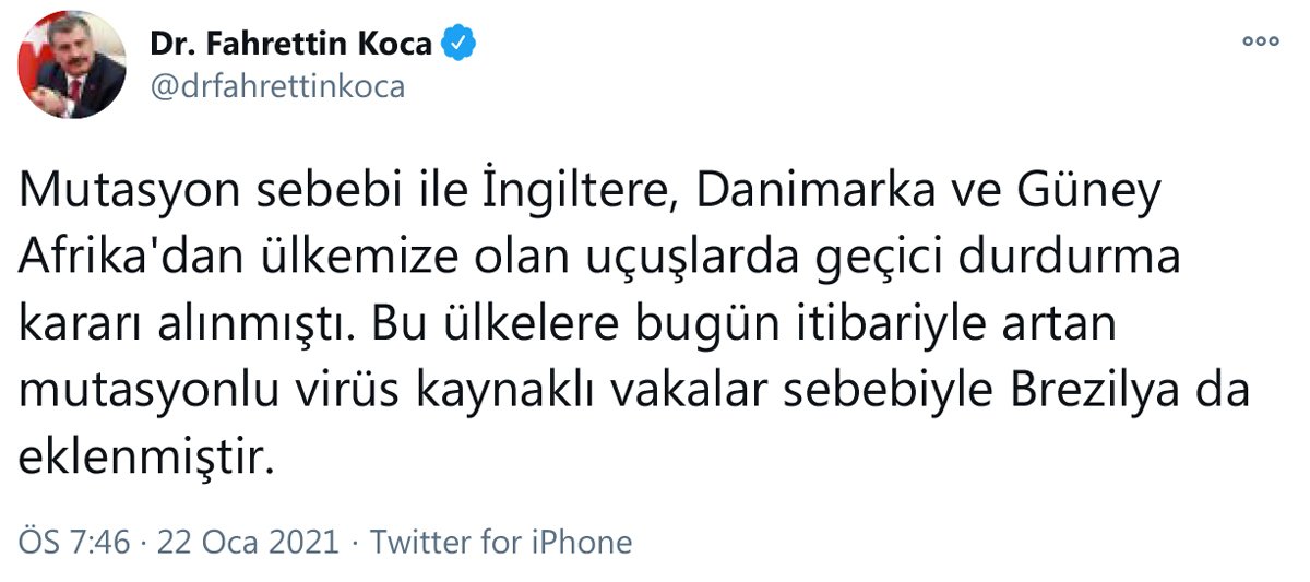 Sağlık Bakanı Fahrettin Koca, corona virüsü mutasyonu sebebiyle İngiltere, Danimarka ve Güney Afrika’nın ardından Brezilya’dan Türkiye’ye uçuşların durdurulduğunu açıkladı.Bakan Koca, paylaşımında şu ifadeleri kullandı:* Mutasyon sebebi ile İngiltere, Danimarka ve Güney Afrika’dan ülkemize olan uçuşlarda geçici durdurma kararı alınmıştı.* Bu ülkelere bugün itibariyle artan mutasyonlu virüs kaynaklı vakalar sebebiyle Brezilya da eklenmiştir.1 OCAK'TA 15 KİŞİDE TESPİT EDİLDİĞİ AÇIKLANMIŞTISağlık Bakanı Fahrettin Koca, 1 Ocak 2021 tarihinde, İngiltere'den Türkiye'ye giriş yapan 15 kişide mutasyonlu corona virüsü tespit edildiğini duyurmuştu.Durumun kontrol altına alındığını aktaran Bakan Koca, “İngiltere’den yurda girişler tamamen durdurulmuştur” ifadelerini kullanmıştı.