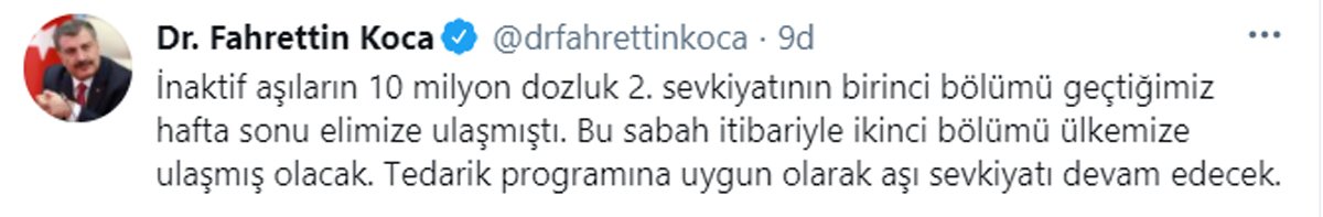 Sağlık Bakanı Fahrettin Koca, Çin’den getirilen corona aşılarıyla ilgili açıklamalarda bulundu.Sosyal medya hesabından açıklama yapan Koca, “İnaktif aşıların 10 milyon dozluk 2. sevkiyatının birinci bölümü geçtiğimiz hafta sonu elimize ulaşmıştı. Bu sabah itibariyle ikinci bölümü ülkemize ulaşmış olacak. Tedarik programına uygun olarak aşı sevkiyatı devam edecek” dedi.