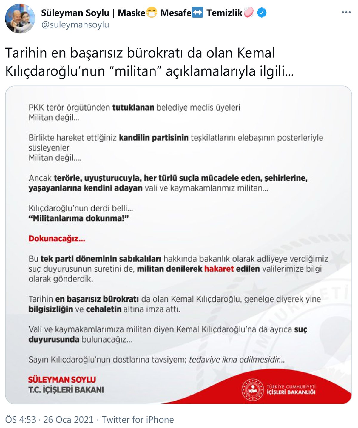 İçişleri Bakanı Süleyman Soylu, “Tarihin en başarısız bürokratı da olan Kemal Kılıçdaroğlu'nun ‘militan’ açıklamalarıyla ilgili” notuyla yaptığı paylaşımda CHP Genel Başkanı Kemal Kılıçdaroğlu hakkında suç duyurusunda bulunacaklarını belirtti.“DOKUNACAĞIZ…”Bakan Soylu, açıklamasında şu ifadelere yer verdi:* PKK terör örgütünden tutuklanan belediye meclis üyeleri militan değil…* Birlikte hareket ettiğiniz kandilin partisinin teşkilatlarını elebaşının posterleriyle süsleyenler militan değil…* Ancak terörle, uyuşturucuyla, her türlü suçla mücadele eden, şehirlerine, yaşayanlarına kendini adayan vali ve kaymakamlarımız militan…* Kılıçdaroğlu’nun derdi belli… “Militanlarıma dokunma!”* Dokunacağız…* Bu tek parti döneminin sabıkalıları hakkında bakanlık olarak adliyeye verdiğimiz suç duyurusunun suretini de militan denilerek hakaret edilen valilerimize bilgi olarak gönderdik.* Tarihin en başarısız bürokratı da olan Kemal Kılıçdaroğlu, genelge diyerek yine bilgisizliğin ve cehaletin altına imza attı.* Vali ve kaymakamlarımıza militan diyen Kemal Kılıçdaroğlu’na da ayrıca suç duyurusunda bulunacağız…* Sayın Kılıçdaroğlu’nun dostlarına tavsiyem; tedaviye ikma edilmesidir…