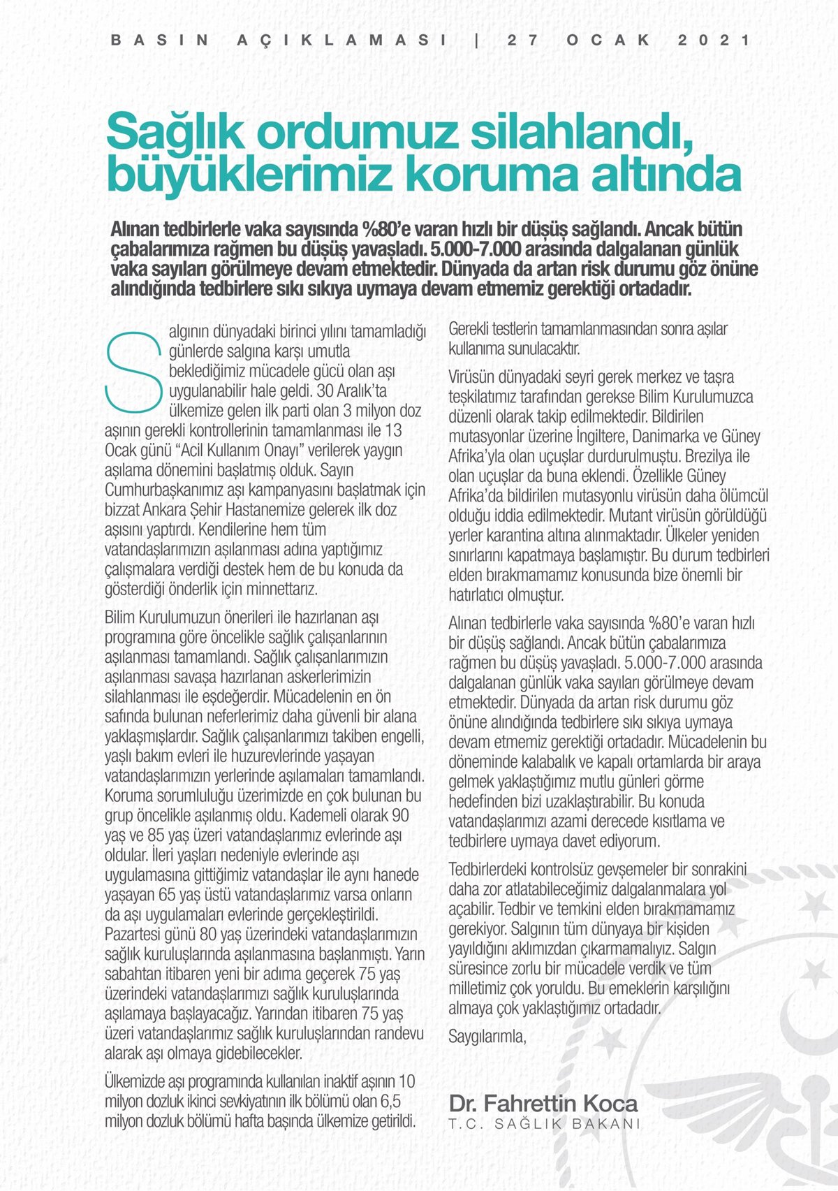 Sağlık Bakanı Fahrettin Koca, Koronavirüs Bilim Kurulu toplantısı sonrası yazılı açıklama yaptı.“Tedbirlerdeki kontrolsüz gevşemeler bir sonrakini daha zor atlatabileceğimiz dalgalanmalara yol açabilir” diyen Bakan Koca, vatandaşlara tedbirlere uyum çağrısı yaptı.“DÜŞÜŞ YAVAŞLADI”“Sağlık ordumuz silahlandı, büyüklerimiz koruma altında” ifadelerini kullanan Bakan Koca, açıklamasında şu ifadelere yer verdi:* Alınan tedbirlerle vaka sayısında %80'e varan hızlı bir düşüş sağlandı. Ancak bütün çabalarımıza rağmen bu düşüş yavaşladı. 5.000-7.000 arasında dalgalanan günlük vaka sayıları görülmeye devam etmektedir. Dünyada da artan risk durumu göz önüne alındığında tedbirlere sıkı sıkıya uymaya devam etmemiz gerektiği ortadadır.* Salgının dünyadaki birinci yılını tamamladığı günlerde salgına karşı umutla beklediğimiz mücadele gücü olan aşı uygulanabilir hale geldi. 30 Aralık'ta ülkemize gelen ilk parti olan 3 milyon doz aşının gerekli kontrollerinin tamamlanması ile 13 Ocak günü “Acil Kullanım Onayı” verilerek yaygın aşılama dönemini başlatmış olduk.AŞILAMADA YENİ ADIM ATILIYOR* Sayın Cumhurbaşkanımız aşı kampanyasını başlatmak için bizzat Ankara Şehir Hastanemize gelerek ilk doz aşısını yaptırdı. Kendilerine hem tüm vatandaşlarımızın aşılanması adına yaptığımız çalışmalara verdiği destek hem de bu konuda da gösterdiği önderlik için minnettarız.* Bilim Kurulumuzun önerileri ile hazırlanan aşı programına göre öncelikle sağlık çalışanlarının aşılanması tamamlandı. Sağlık çalışanlarımızın aşılanması savaşa hazırlanan askerlerimizin silahlanması ile eşdeğerdir. Mücadelenin en ön safında bulunan neferlerimiz daha güvenli bir alana yaklaşmışlardır.* Sağlık çalışanlarımızı takiben engelli, yaşlı bakım evleri ile huzurevlerinde yaşayan vatandaşlarımızın yerlerinde aşılamaları tamamlandı. Koruma sorumluluğu üzerimizde en çok bulunan bu grup öncelikle aşılanmış oldu.* Kademeli olarak 90 yaş ve 85 yaş üzeri vatandaşlarımız evlerinde aşı oldular. İleri yaşları nedeniyle evlerinde aşı uygulamasına gittiğimiz vatandaşlar ile aynı hanede yaşayan 65 yaş üstü vatandaşlarımız varsa onların da aşı uygulamaları evlerinde gerçekleştirildi.* Pazartesi günü 80 yaş üzerindeki vatandaşlarımızın sağlık kuruluşlarında aşılanmasına başlanmıştı. Yarın sabahtan itibaren yeni bir adıma geçerek 75 yaş üzerindeki vatandaşlarımızı sağlık kuruluşlarında aşılamaya başlayacağız. Yarından itibaren 75 yaş üzeri vatandaşlarımız sağlık kuruluşlarından randevu alarak aşı olmaya gidebilecekler.GÜNEY AFRİKA’DA BİLDİRİLEN MUTASYON DAHA ÖLÜMCÜL İDDİASI* Ülkemizde aşı programında kullanılan inaktif aşının 10 milyon dozluk ikinci sevkiyatının ilk bölümü olan 6,5 milyon dozluk bölümü hafta başında ülkemize getirildi. Gerekli testlerin tamamlanmasından sonra aşılar kullanıma sunulacaktır.* Virüsün dünyadaki seyri gerek merkez ve taşra teşkilatımız tarafından gerekse Bilim Kurulumuzca düzenli olarak takip edilmektedir. Bildirilen mutasyonlar üzerine İngiltere, Danimarka ve Güney Afrika'yla olan uçuşlar durdurulmuştu. Brezilya ile olan uçuşlar da buna eklendi.* Özellikle Güney Afrika'da bildirilen mutasyonlu virüsün daha ölümcül olduğu iddia edilmektedir. Mutant virüsün görüldüğü yerler karantina altına alınmaktadır. Ülkeler yeniden sınırlarını kapatmaya başlamıştır. Bu durum tedbirleri elden bırakmamamız konusunda bize önemli bir hatırlatıcı olmuştur.“YENİ DALGALANMALARA YOL AÇABİLİR”* Alınan tedbirlerle vaka sayısında %80'e varan hızlı bir düşüş sağlandı. Ancak bütün çabalarımıza rağmen bu düşüş yavaşladı. 5.000-7.000 arasında dalgalanan günlük vaka sayıları görülmeye devam etmektedir. Dünyada da artan risk durumu göz önüne alındığında tedbirlere sıkı sıkıya uymaya devam etmemiz gerektiği ortadadır.* Mücadelenin bu döneminde kalabalık ve kapalı ortamlarda bir araya gelmek yaklaştığımız mutlu günleri görme hedefinden bizi uzaklaştırabilir. Bu konuda vatandaşlarımızı azami derecede kısıtlama ve tedbirlere uymaya davet ediyorum.* Tedbirlerdeki kontrolsüz gevşemeler bir sonrakini daha zor atlatabileceğimiz dalgalanmalara yol açabilir. Tedbir ve temkini elden bırakmamamız gerekiyor. Salgının tüm dünyaya bir kişiden yayıldığını aklımızdan çıkarmamalıyız. Salgın süresince zorlu bir mücadele verdik ve tüm milletimiz çok yoruldu. Bu emeklerin karşılığını almaya çok yaklaştığımız ortadadır.