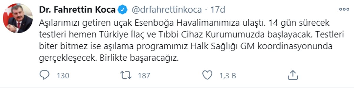 Sağlık Bakanı Fahrettin Koca sosyal medya hesabından yaptığı paylaşım ile Çin'den ithal edilen Covid-19 aşılarının 29 Aralık Salı günü saat 19.50'de Pekin Havalimanından havalandığını duyurmuştu. Pekin'den o saatlerde havalanan uçak 30 Aralık Çarşamba günü saat 05.45 itibariyle Ankara Esenboğa Havalimanı'na ulaştı.Aşılar buradan TIR’lara yüklenerek Sağlık Bakanlığı Halk Sağlığı Genel Müdürlüğü depolarına taşınacak. Daha sonra Türkiye İlaç ve Tıbbi Cihaz Kurumu'nda yapılacak 14 günlük testlerden onay alırsa aşılama başlayacak.4 aşamada gerçekleşecek aşılama işlemi ilk olarak Covid-19 ile birebir temas halinde olan sağlık çalışanlarına ve 65 yaş üzeri vatandaşlara uygulanacak. Çin'den getirilen inaktif Covid-19 aşısı 2 doz şeklinde uygulanıyor.BAKAN KOCA’DAN İLK AÇIKLAMAAşıların gelmesinin ardından Twitter hesabından bir açıklama yapan Sağlık Bakanı Fahrettin Koca, “Aşılarımızı getiren uçak Esenboğa Havalimanımıza ulaştı. 14 gün sürecek testleri hemen Türkiye İlaç ve Tıbbi Cihaz Kurumumuzda başlayacak” ifadelerini kullandı.