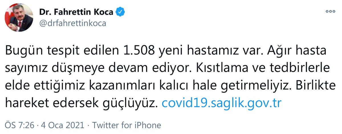 “KAZANIMLARI KALICI HALE GETİRMELİYİZ”Sosyal medya hesabından güncel corona virüsü verilerini değerlendiren Sağlık Bakanı Fahrettin Koca, vatandaşlara tedbir çağrısında bulundu.Bakan Koca, “Ağır hasta sayımız düşmeye devam ediyor. Kısıtlama ve tedbirlerle elde ettiğimiz kazanımları kalıcı hale getirmeliyiz. Birlikte hareket edersek güçlüyüz” ifadelerini kullandı.DÜN 9 BİN 877 YENİ VAKA TESPİT EDİLMİŞTİSağlık Bakanlığı’nın 3 Ocak 2021 Pazar günü verilerine göre semptom gösteren bin 515 hastayla birlikte 9 bin 877 yeni vaka tespit edilmişti. 193 kişi hayatını kaybederken 10 bin 102 kişi de sağlığına kavuşmuştu.