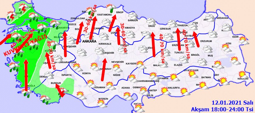 FIRTINA VE YAĞIŞ UYARILARIMeteoroloji, fırtına ve yağış uyarılarında şu ifadeleri kullandı:* Marmara’nın güneyi, Ege, İç Anadolu'nun güney ve doğusu, Akdeniz'in iç ve yüksek kesimleri ile Orta ve Doğu Karadeniz’in iç kesimlerinde güney yönlerden kuvvetli rüzgar ve fırtına (50-80 km/sa, yüksek kesimlerde kısa süreli kuvvetli fırtına (90-120 km/sa) beklendiğinden ulaşımda aksamalar, çatı uçması, ağaç devrilmesi, soba ve baca gazı zehirlenmeleri, İç Anadolu'nun güneyinde toz fırtınası gibi olumsuzluklara karşı dikkatli ve tedbirli olunmalıdır.