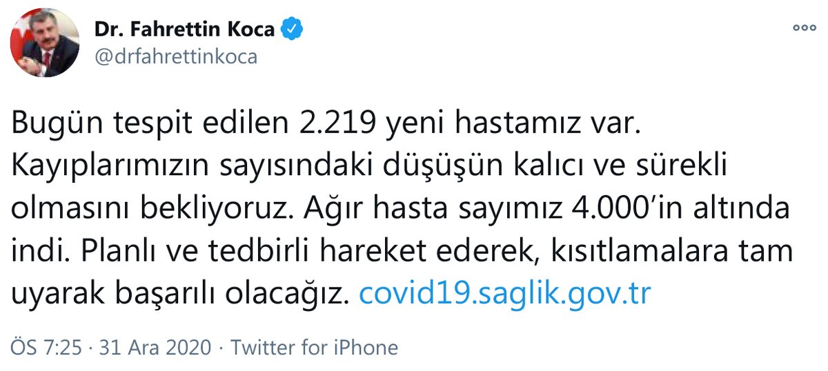 BAKAN KOCA’DAN ‘KISITLAMAYA UYUM’ MESAJISosyal medya hesabından güncel corona virüsü verilerini değerlendiren Sağlık Bakanı Fahrettin Koca, “Kayıplarımızın sayısındaki düşüşün kalıcı ve sürekli olmasını bekliyoruz. Ağır hasta sayımız 4.000'in altında indi. Planlı ve tedbirli hareket ederek, kısıtlamalara tam uyarak başarılı olacağız” dedi.DÜN 254 KİŞİ HAYATINI KAYBETMİŞTİSağlık Bakanlığı’nın açıkladığı 30 Aralık corona tablosuna göre semptom gösteren 2 bin 612 hastayla birlikte 15 bin 692 yeni vaka tespit edilmişti. 254 kişi yaşamını yitirirken 20 bin 192 kişi de iyileşmişti.